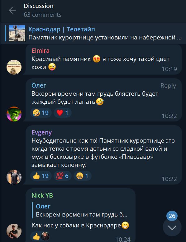 Мнения разделились иначе под постом в одном из пабликов Краснодара. Его авторы задали тон обсуждения описанием: «Курортница прекрасна и счастлива — она без мужа, без детей, на каблуках и готова к увлекательным приключениям».