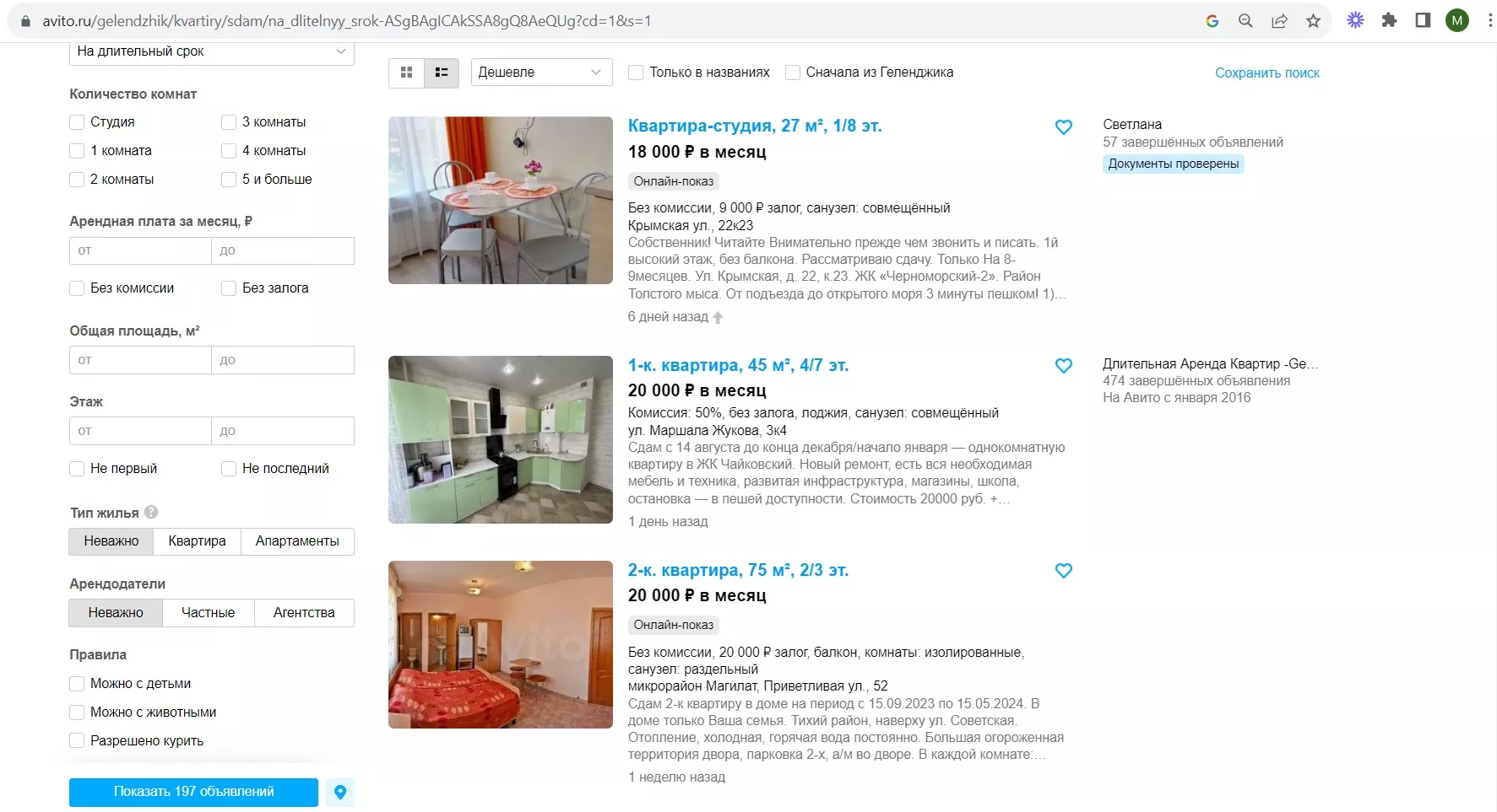 На популярном сайте объявлений 7 августа есть предложения по долгосрочной аренде однокомнатных квартир в Геленджике по цене от 18 тыс. рублей.
