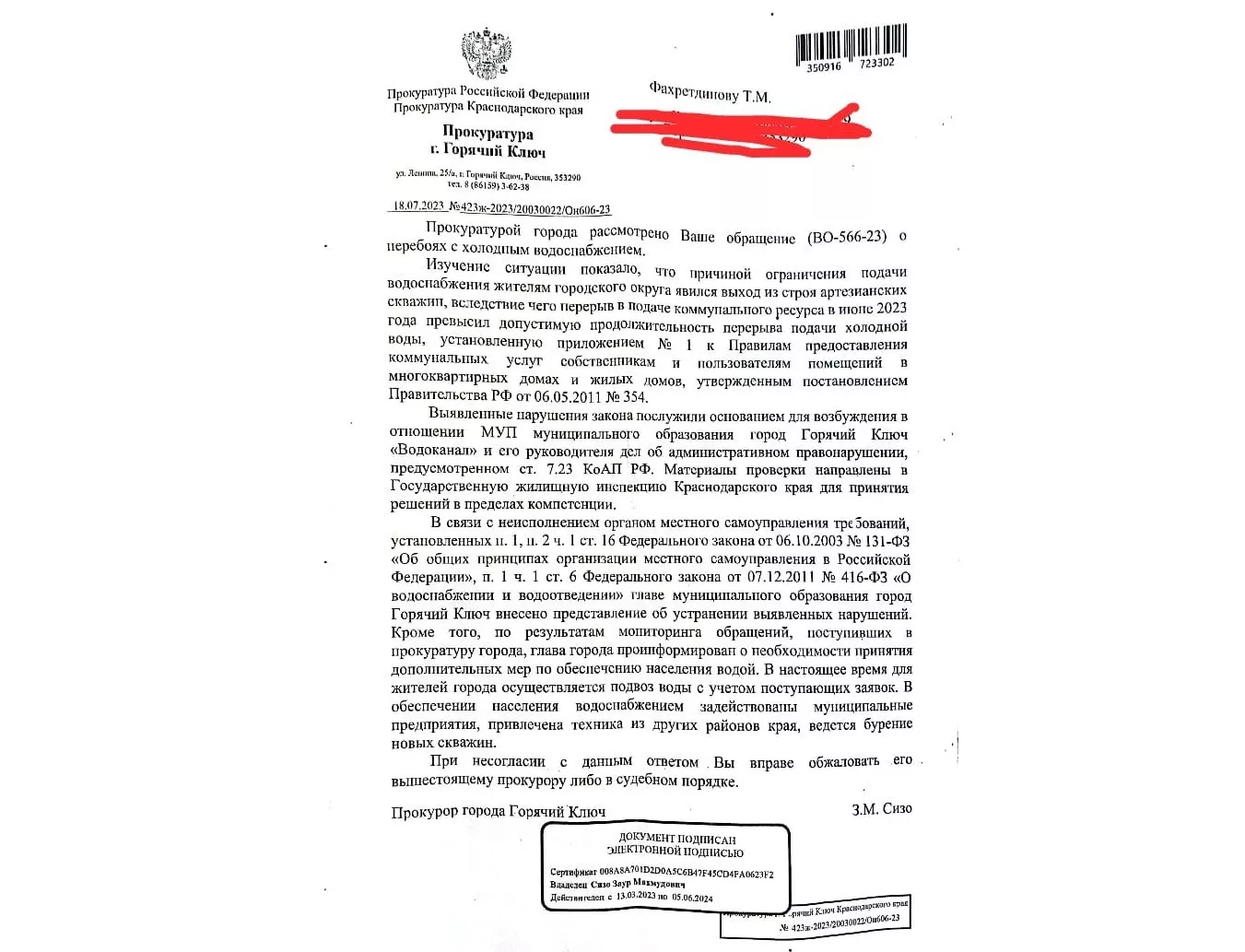 Он показал редакции Юга.ру ответ прокуратуры Горячего Ключа от 18 июля на коллективную жалобу. В нем перебои водоснабжения объяснили выходом из строя артезианских скважин.