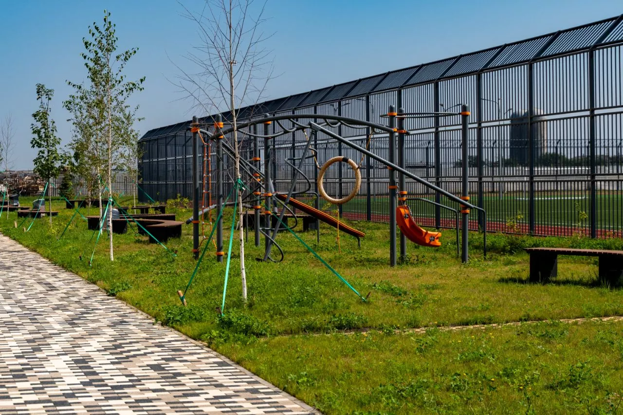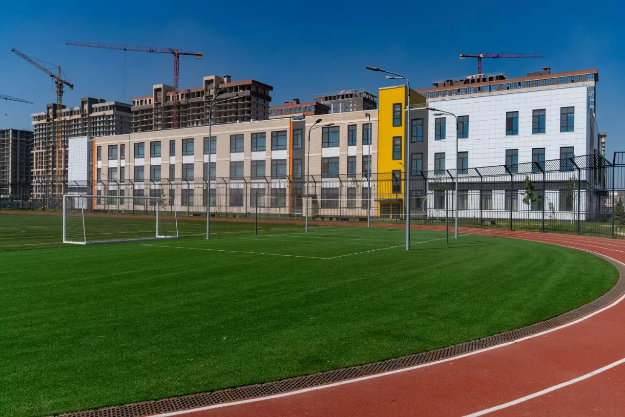 Помимо самого здания, застройщик полностью благоустроил территорию школы. Спортивная зона включает в себя современное футбольное поле, баскетбольную и волейбольную площадки, беговые дорожки и воркаут-зону. Для досуга и уроков на свежем воздухе по всей территории расположили горки, качели, удобные скамейки.