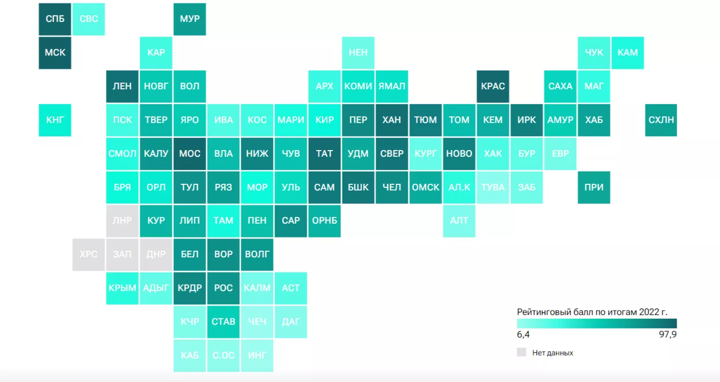 Ростовская область заняла 21 позицию с рейтинговым показателем 68. Ставропольский край оказался на 45 месте (60,6), Крым — на 59 (55,6), а Адыгея — на 72 (48,3).