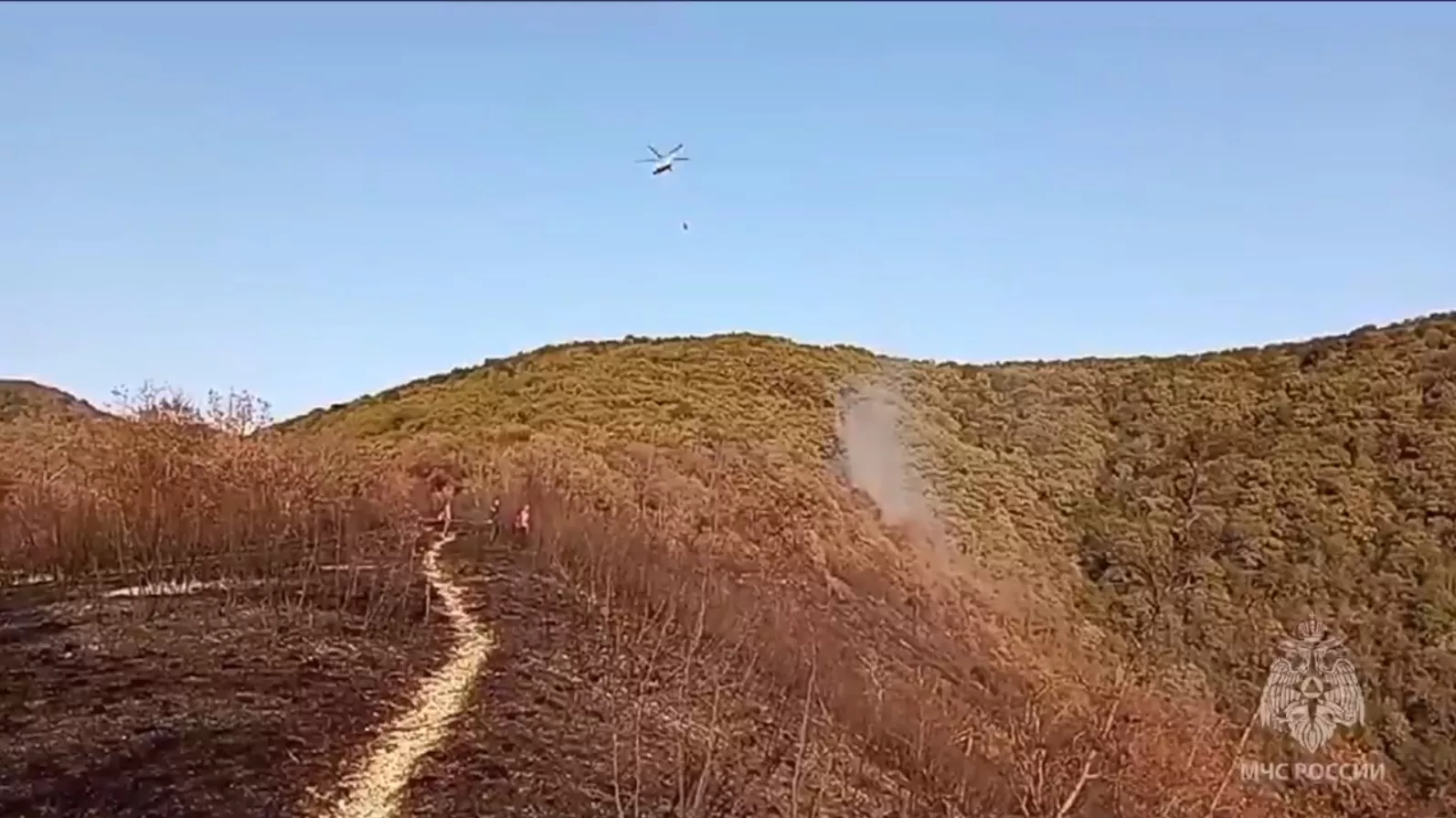 Всего на месте работали 118 специалистов и 11 единиц техники. К ликвидации пожара привлекли вертолет Ми-8 МЧС России, он совершил восемь сбросов воды.