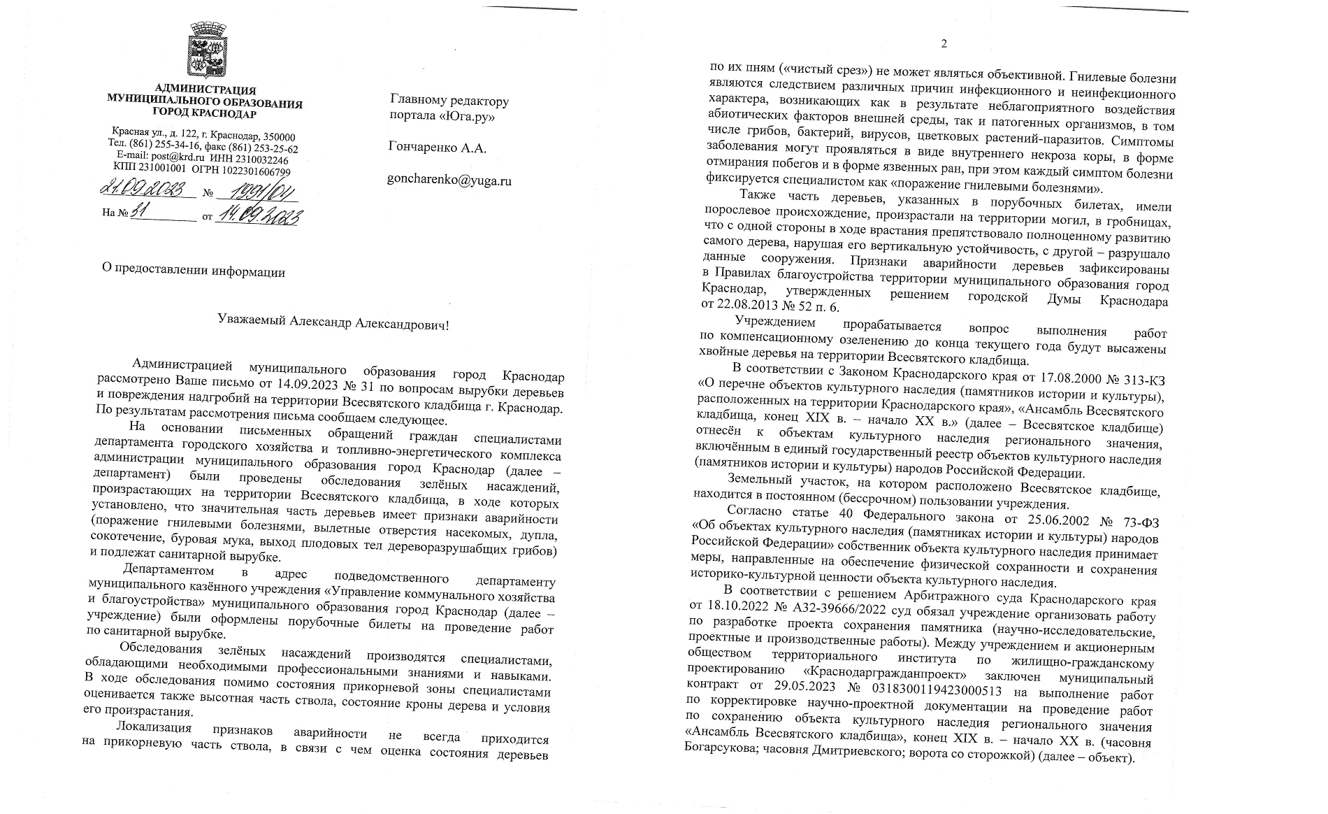 22 сентября заместитель главы Краснодара Владимир Архипов ответил Юга.ру о принципах выдачи порубочных билетов, пояснив, что «чистый срез» пней спиленных деревьев не свидетельствует о их здоровье. Архипов уточнил, что специалисты департамента городского хозяйства и топливно-энергетического комплекса обследовали деревья на Всесвятском кладбище по обращениям граждан и заключили: