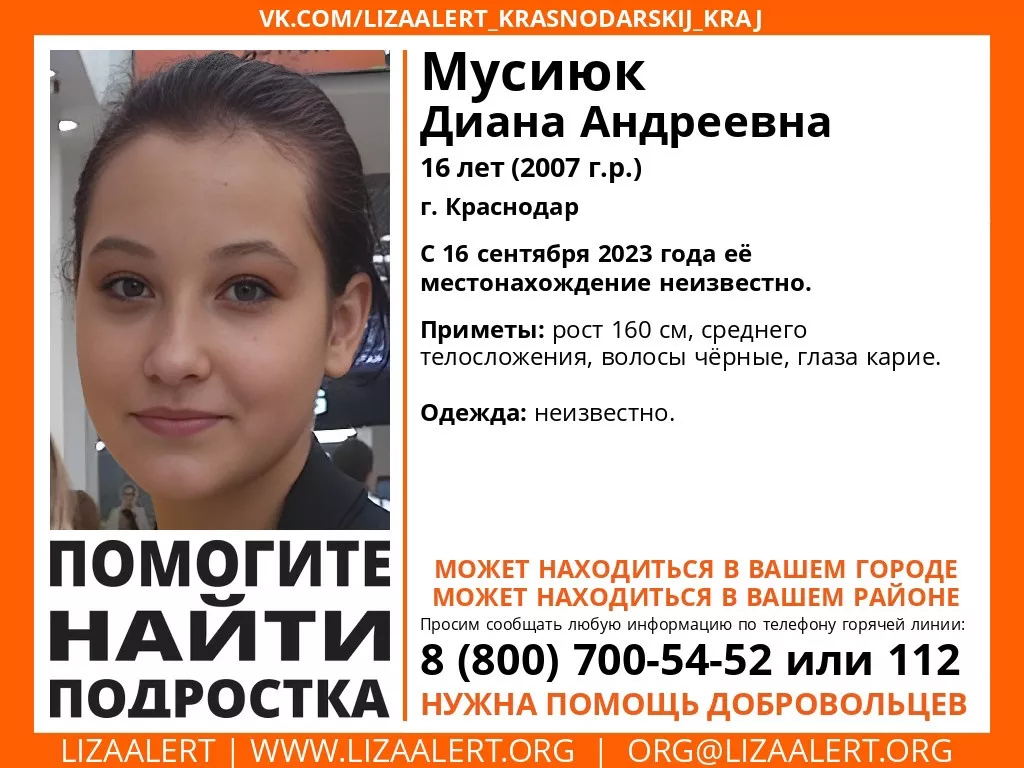 В Краснодаре идут поиски 16-летней Дианы Мусиюк. На сайте поисково-спасательного отряда «ЛизаАлерт» опубликована ориентировка и информация о том, что с 16 сентября местонахождение девочки неизвестно.