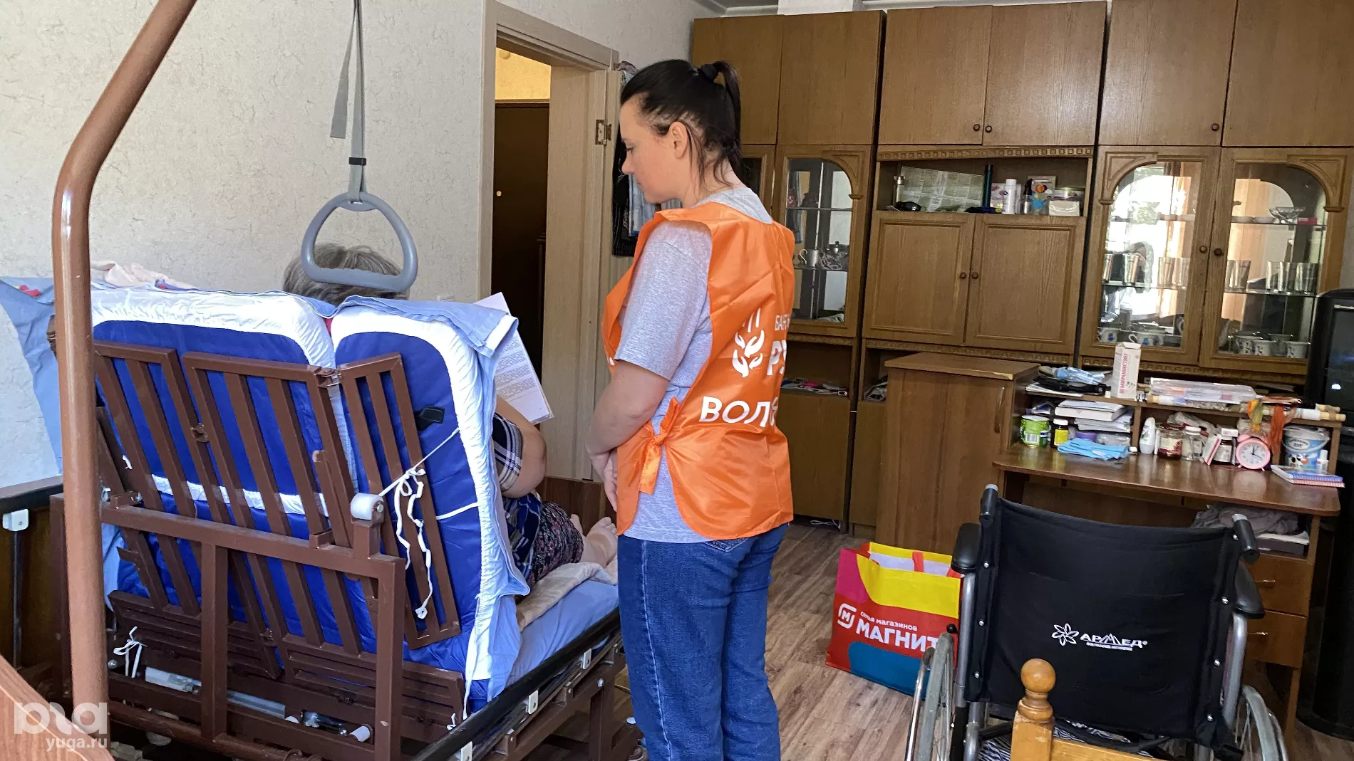 Сегодня среди получателей была жительница Краснодара Ирина. У женщины серьезные проблемы с ногами и она не встает с кровати. Волонтеры заносят сумку с едой прямо в квартиру и просят женщину расписаться.