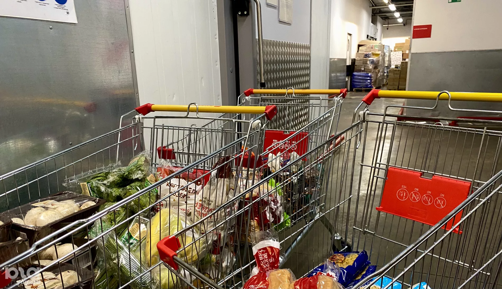 Схема достаточно простая — сначала на пульт сотрудника торгового зала поступает заявка. Затем начинается её сборка. Работник магазина по списку набирает продукты и проверяет, чтобы они соответствовали необходимым критериям. После этого он передает еду волонтерам. Они еще раз проверяют продукцию и складывают её в многоразовые сумки.