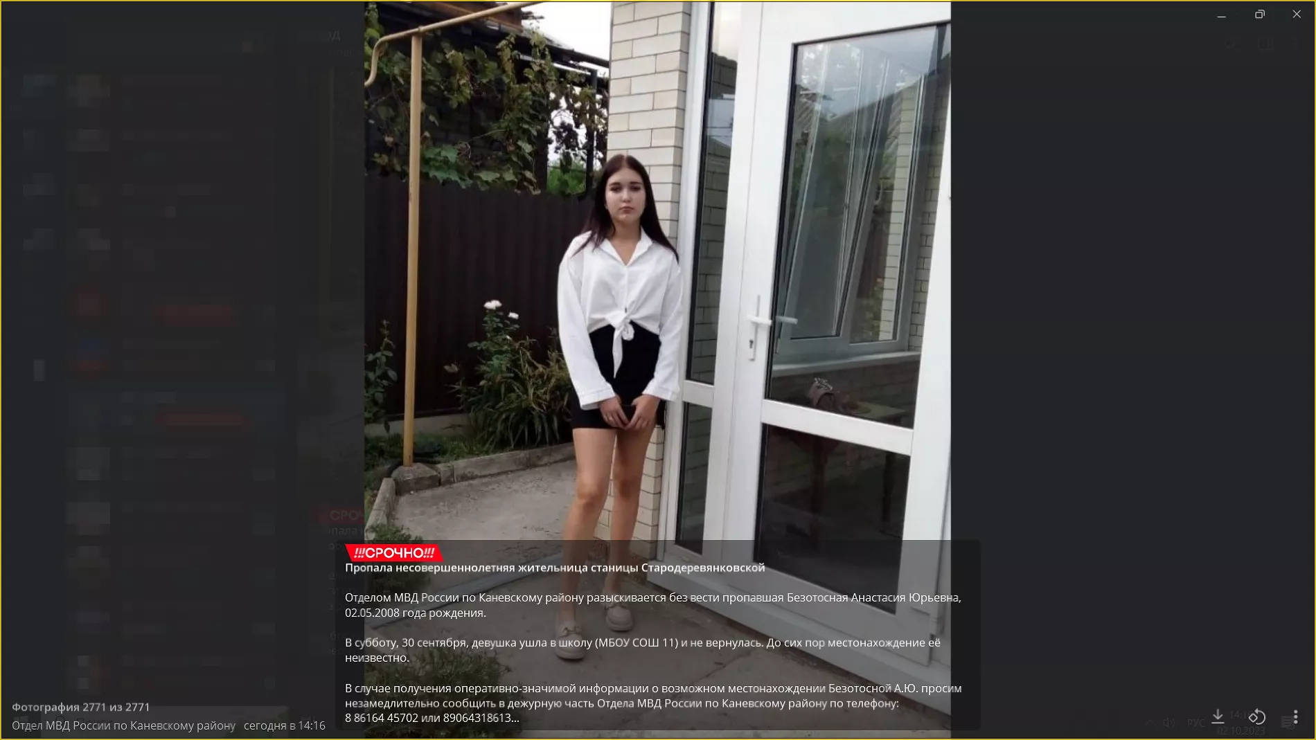 Полиция Каневского района Краснодарского края ищет 15-летнюю Анастасию Безотосную. Жительница станицы Стародеревянковской пропала 30 сентября.