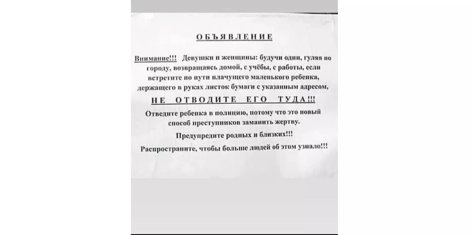 На распространяемом фото видно лист офисной бумаги с текстом: «Девушки и женщины: будучи одни, гуляя по городу, возвращаясь домой, с учебы, с работы, если встретите по пути плачущего маленького ребенка, держащего в руках листок бумаги с указанным адресом, НЕ ОТВОДИТЕ ЕГО ТУДА! Отведите ребенка в полицию, потому что это новый способ преступников заманить жертву».