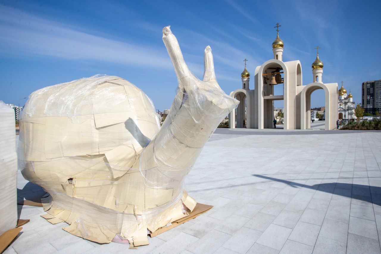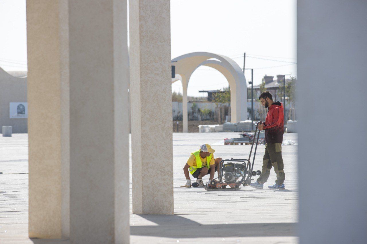 На территории парка уже стоят лавочки и построен спортивный комплекс. Также закончили работу над амфитеатром и освещением. На входе установили звонницу.