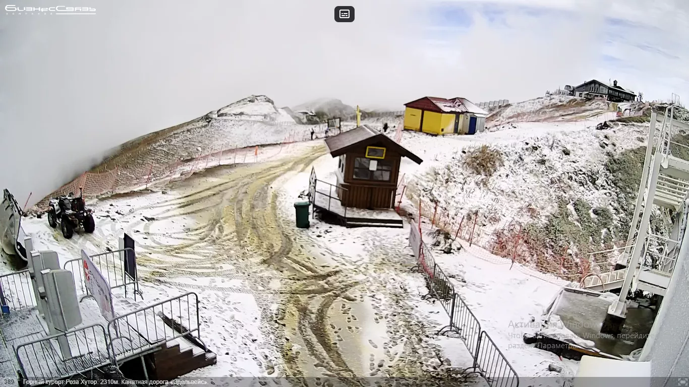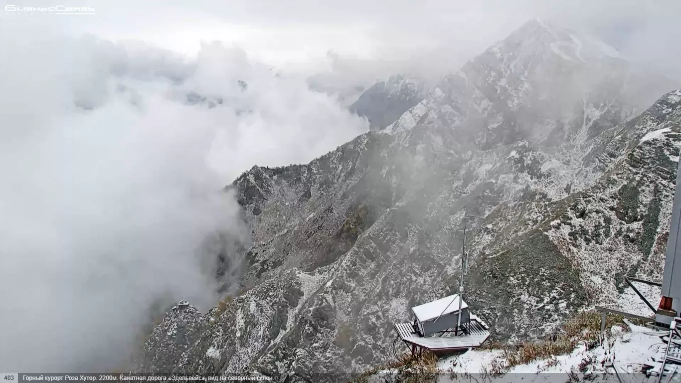 Синоптики краснодарского гидрометцентра обещали, что 9 октября на Кубани ухудшится погода. Обширный атмосферный фронт принес похолодание и снег в горах. На курорте «Роза Хутор» небольшой снег выпал на высоте 2200 метров и выше. Вот так выглядит вид на северный склон около канатной дороги «Эдельвейс»: