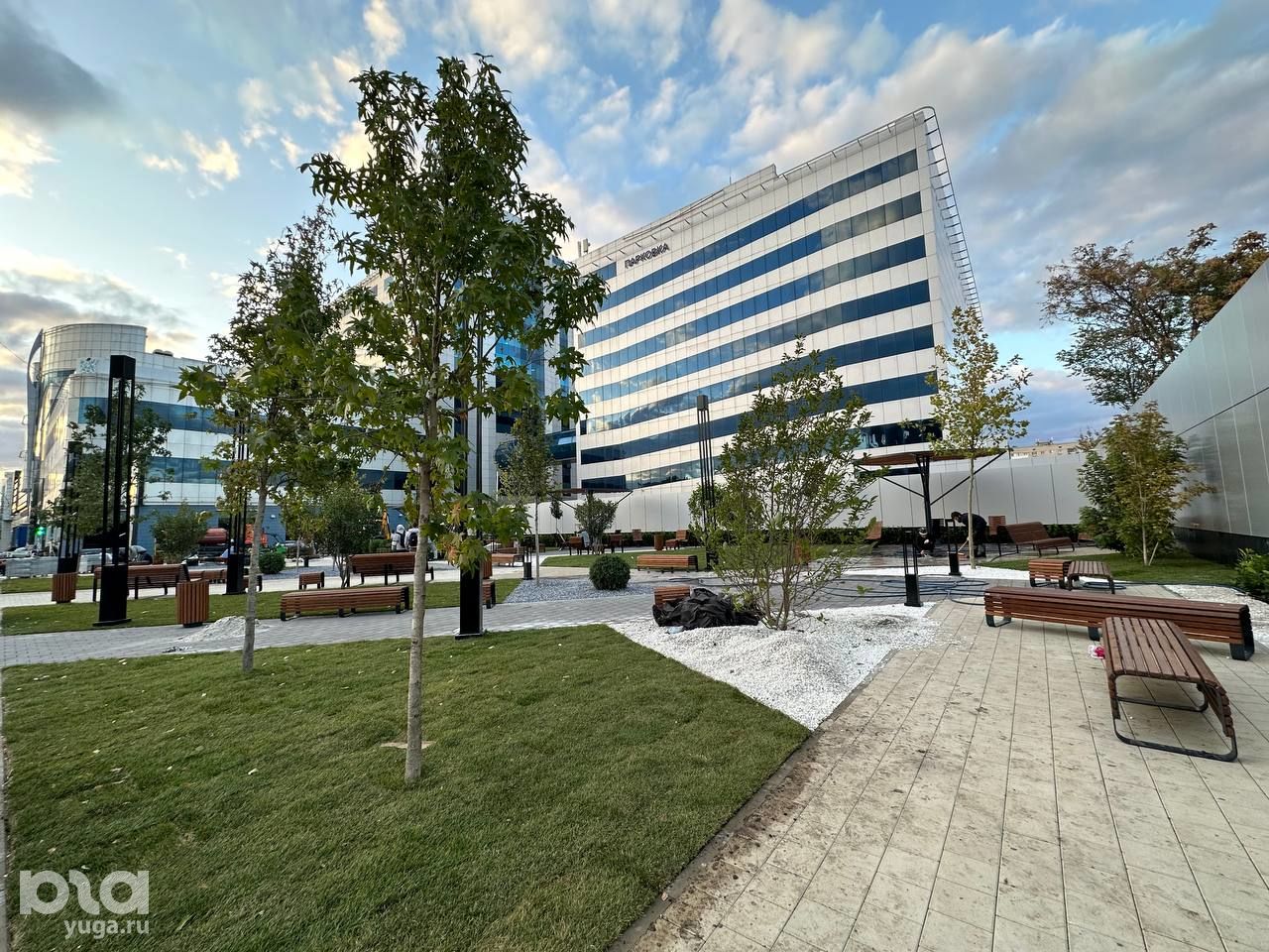 В Краснодаре на улице Северной у бизнес-центра «Кристалл» появился небольшой сквер. Долгое время участок был огражден, на его территории планировали построить жилой дом высотой 100 метров (27 этажей).