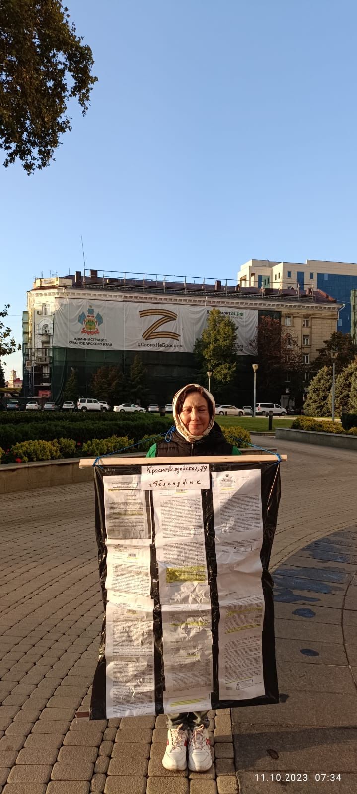 Жительница Геленджика Людмила Гуслякова продолжает голодовку у стен администрации Краснодарского края. Женщина второй день стоит на площади у здания с плакатом.