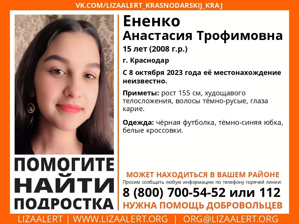 Полиция и волонтеры ищут в Краснодаре 15-летнюю Анастасию Ененко