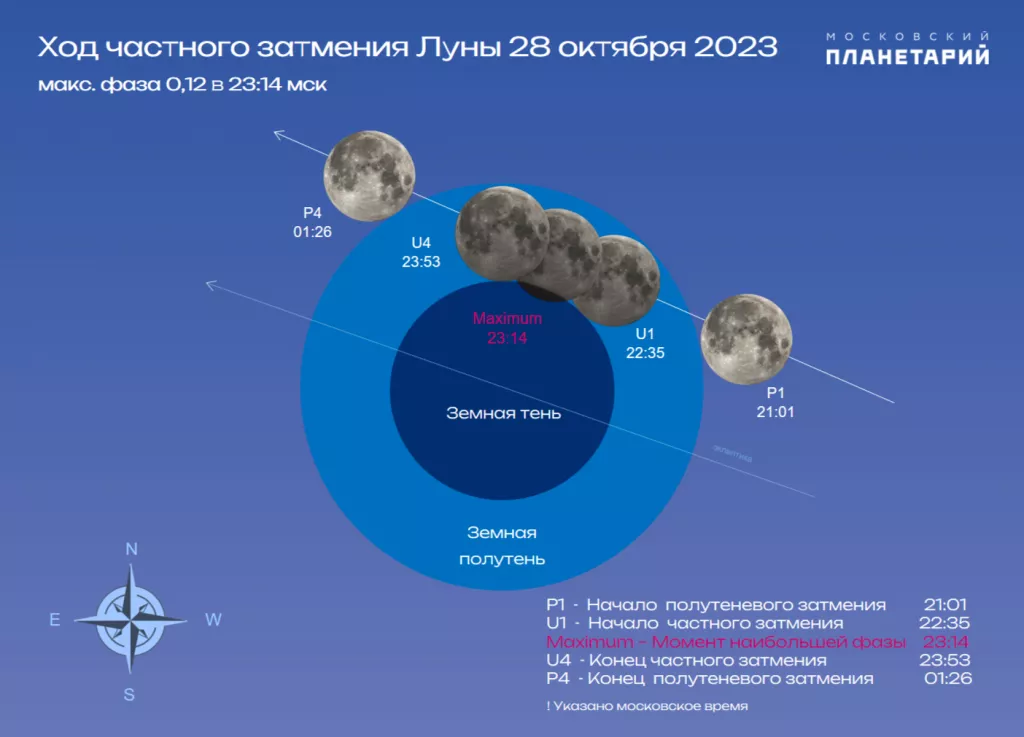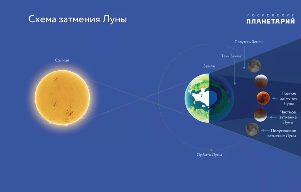 В Московском планетарии сообщили, что наибольшая теневая фаза произойдет в 23:14 по московскому времени. Ее будет видно на всей территории России. Затмение завершится в 23:53.