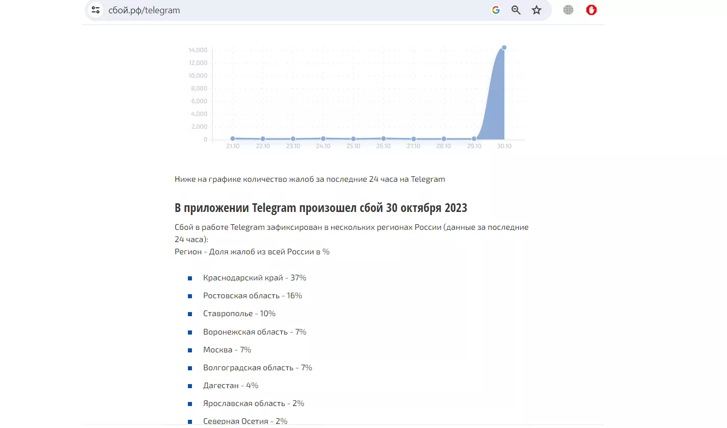 37% российских пользователей Telegram, сообщивших о сбоях, находятся в Краснодарском крае