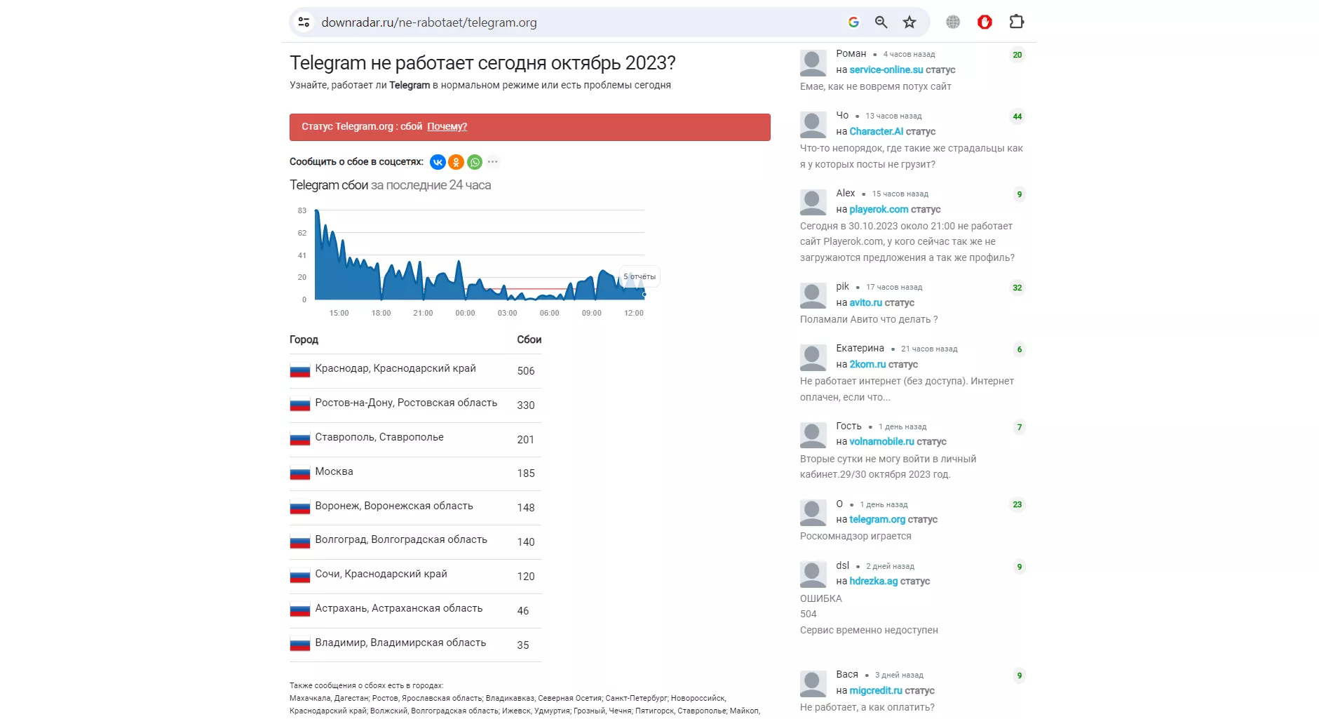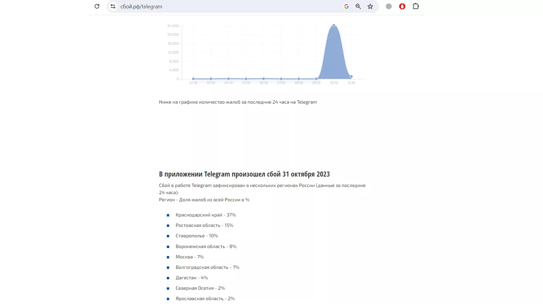 Как и вчера, 31 октября «Сбой.ру» получает больше всего сообщений из Краснодарского края (37%), Ростовской области (15%), Ставропольского края (10%), Воронежской области (8%), Москвы (7%), Волгоградской области (7%) и Дагестана (4%)
