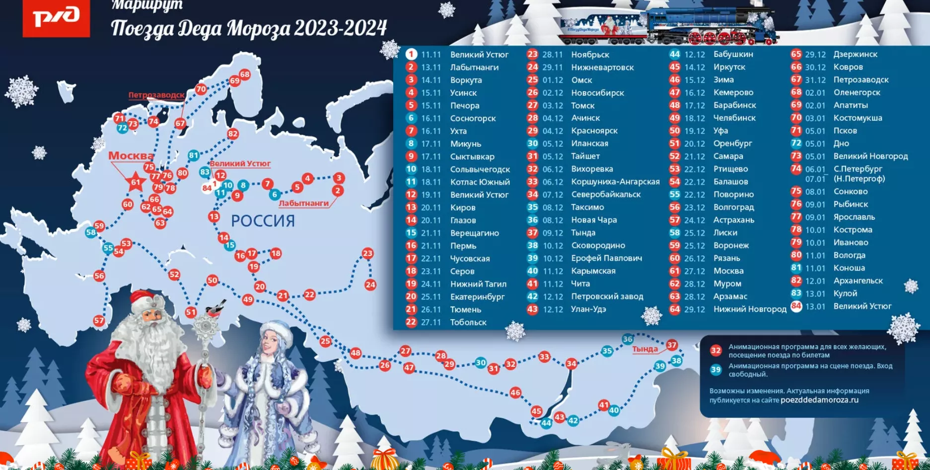 Дед Мороз посетит 83 города России, однако в южные города он не поедет. В Краснодаре, Сочи и Ростове-на-Дону поезд останавливаться не будет. Вот его подробный маршрут: