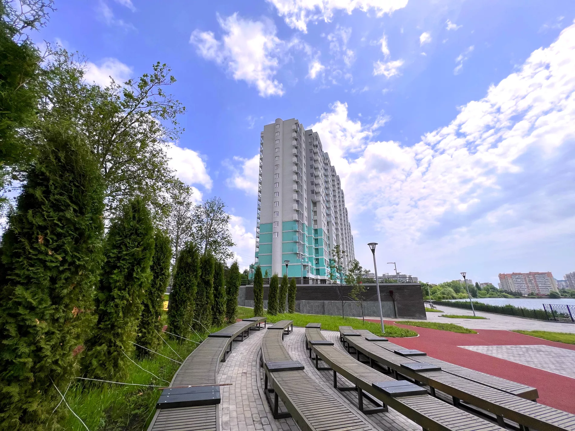 Из каждой квартиры открывается вид на озеро. Рядом нет высотных домов, ближайшие — на другой стороне водоема или сбоку и не закрывают вид.
