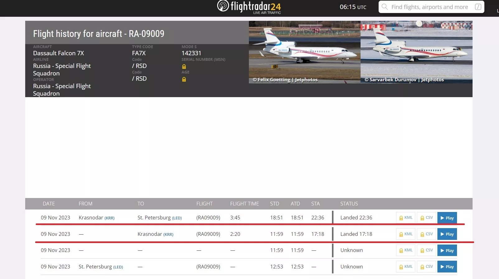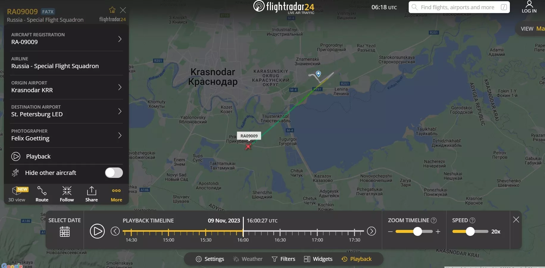 Вечером того же дня, когда сайт аэропорта рассказал об учениях, из Краснодара вылетел борт RA-09009. По информации из открытых источников, это судно специального лётного отряда на базе госавиакомпании «Россия» для перевозки высших должностных лиц государства. Самолет прилетел в Краснодар из неизвестного города, а потом отправился в Санкт-Петербург.