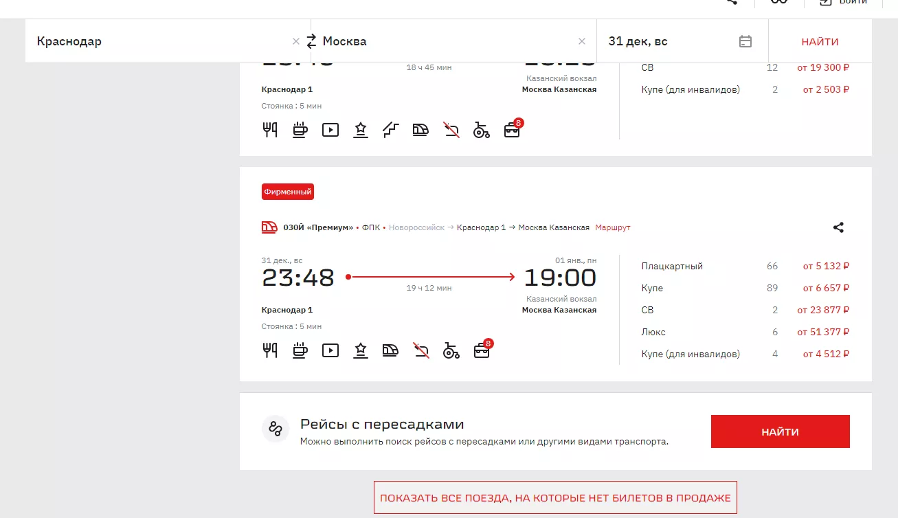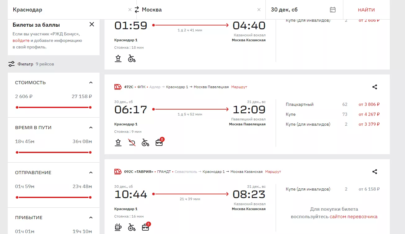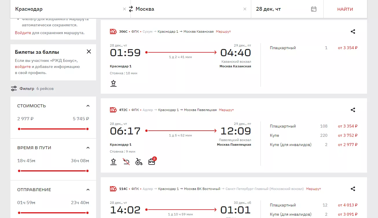 На рейс «Сухум — Москва Казанская», выезжающий из Краснодара 28 декабря в 01:59 остался только один плацкартный билет стоимостью от 3354 рублей. Правда, ехать придется больше суток.