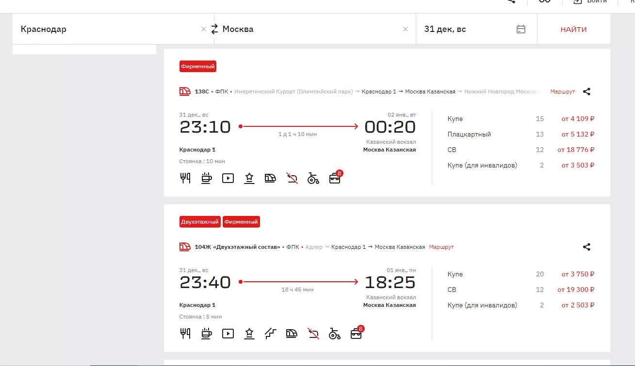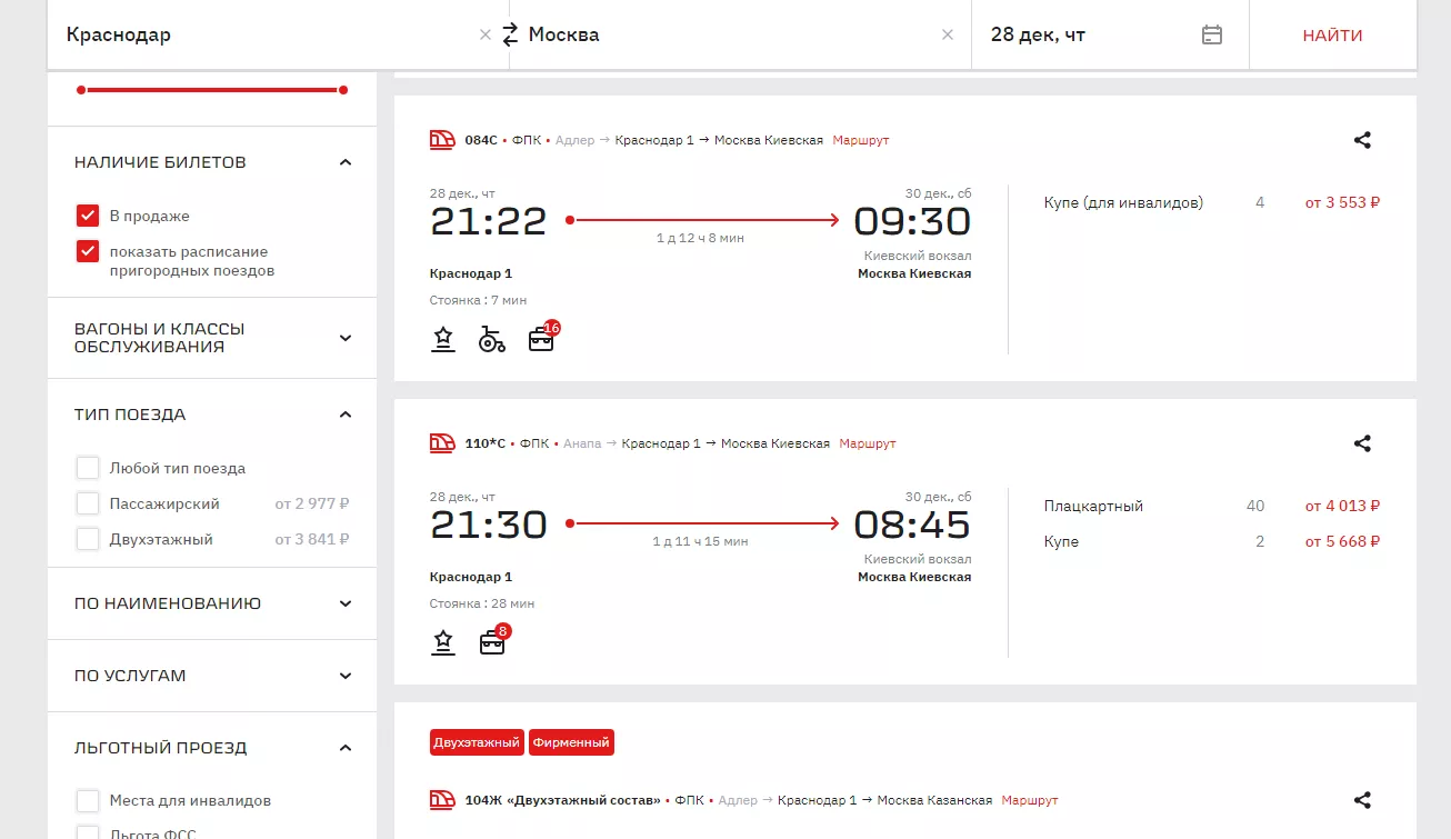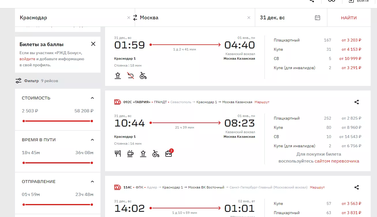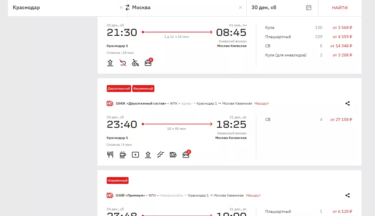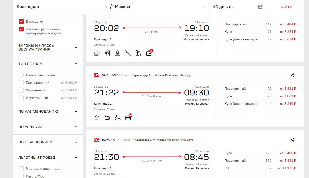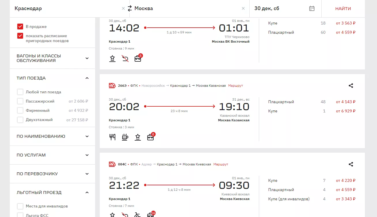 30 декабря можно выехать из Краснодара в 06:17. На этот поезд еще есть 61 место в плацкарт с билетами от 3806 рублей и 70 в купе (от 4267 рублей).