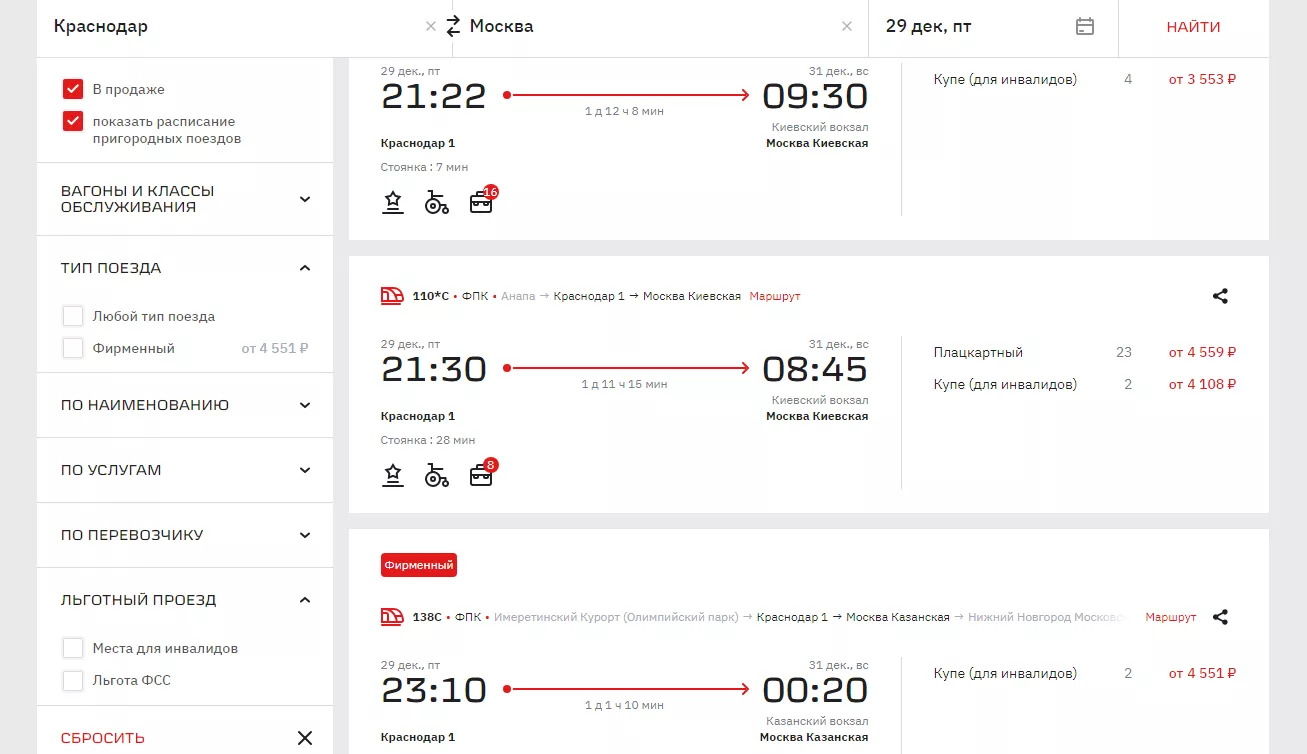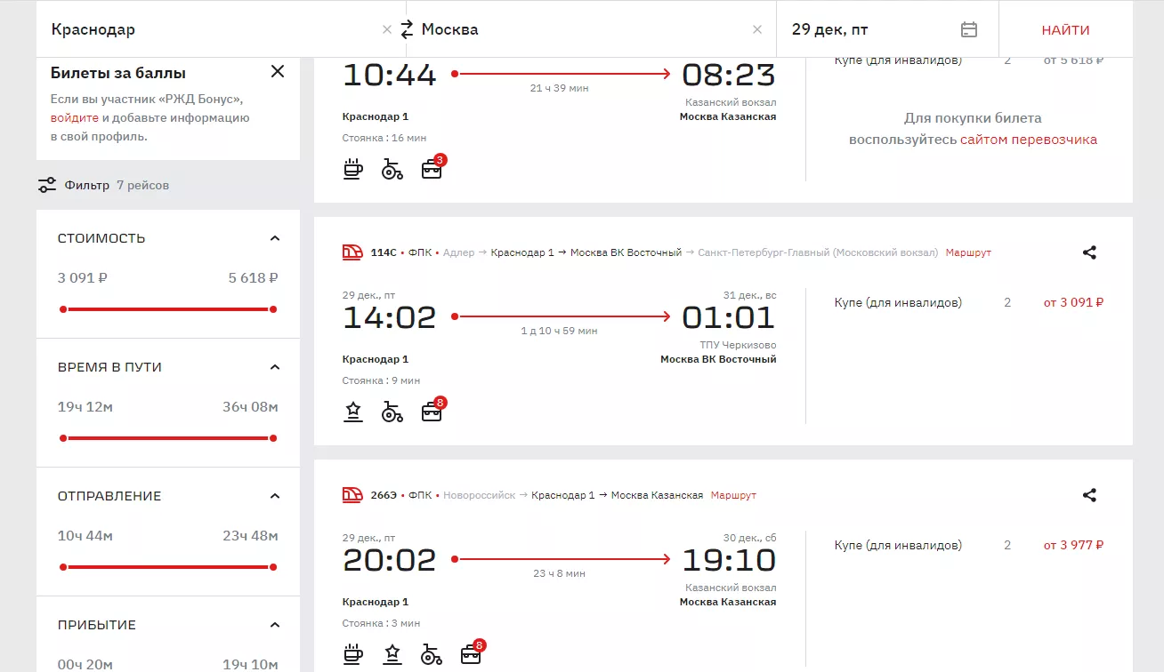 Если соберетесь выезжать 29 декабря, то вариантов осталось совсем мало. В шести поездах остались билеты только в купе для инвалидов. Можно успеть взять места на рейс с отправлением в 21:30. Там еще есть 23 билета в плацкарт стоимостью от 4559 рублей.