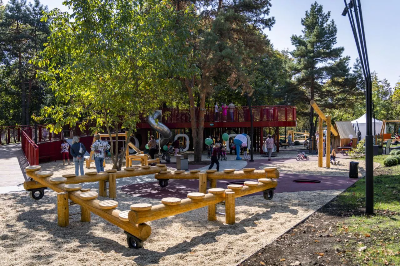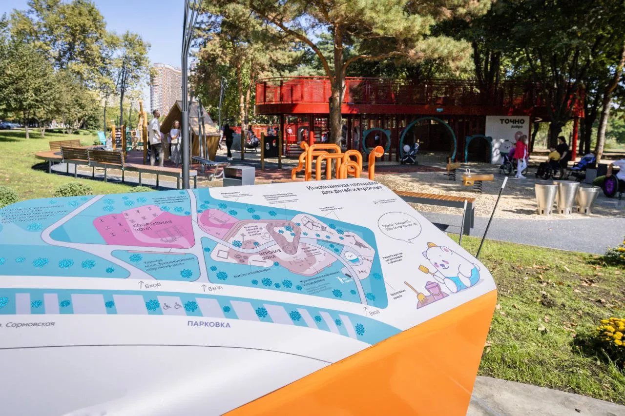 Площадку открыли в сентябре 2023 года, и местные жители уже успели ее оценить. Территорию в 4 тыс. кв. метров разделили на игровую и спортивную зоны. В центре локации для игр — двухуровневая площадка с широким пандусом, по которому удобно подниматься на коляске. Спуститься с площадки можно также по двум горкам и винтовой лестнице. В игровой зоне — сетки для игр, качели-гнезда, песочница, бизиборды, музыкальное оборудование, доска для рисования.