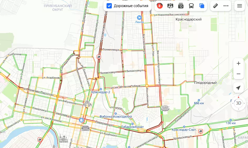 Больше всего пробок в северной части города — на улицах Российская и Дзержинского. Ростовское шоссе стоит в обе стороны из-за аварии между Зиповской и Солнечной.