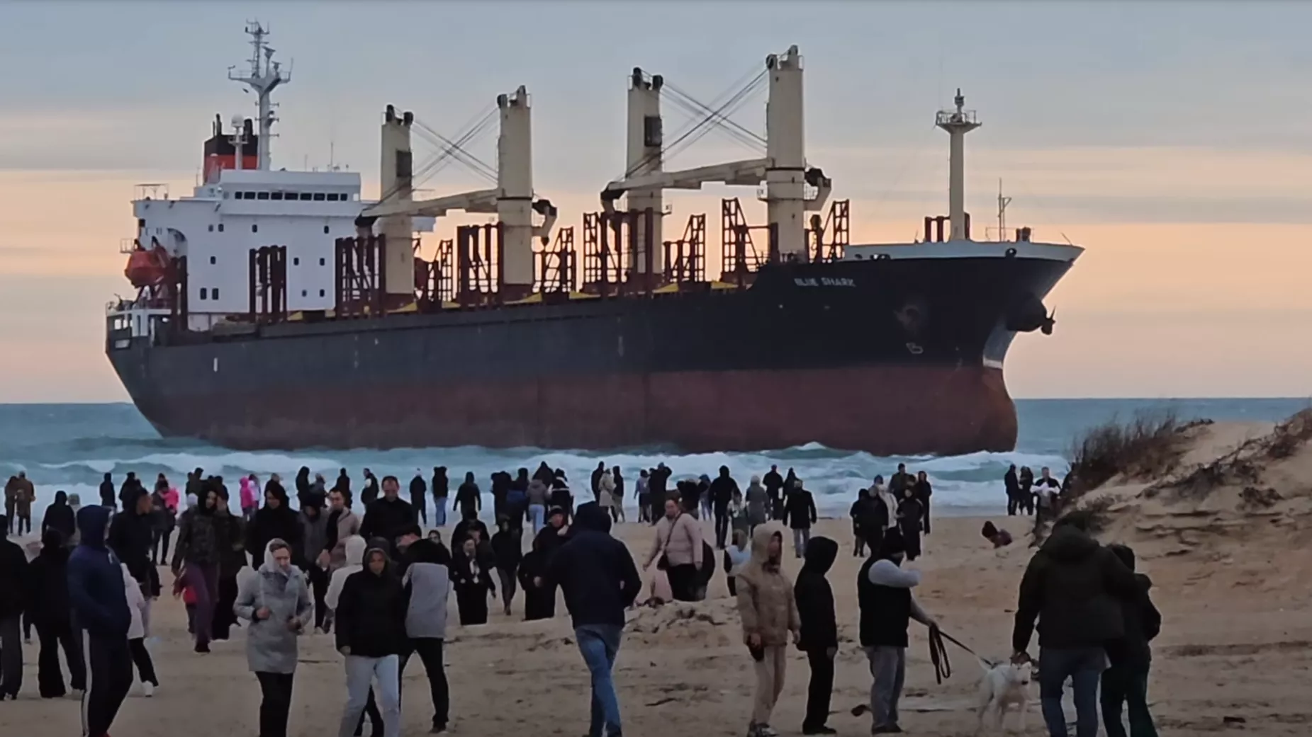 4 декабря блогер Юра Озаровский опубликовал в своем ютуб-канале видео, на котором видно, как сотни человек приходят на пляж поселка Витязево, чтобы посмотреть на сухогруз Blue Shark.