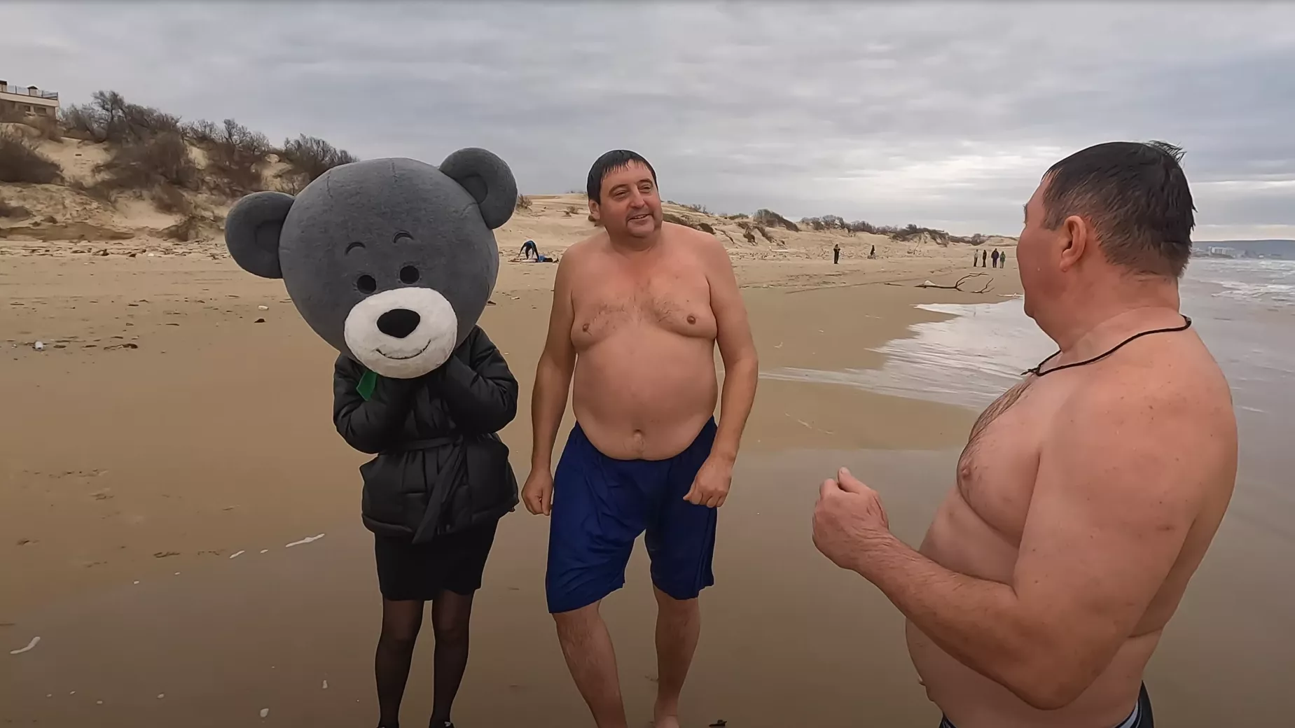 Первые выходные зимы были довольно теплыми, поэтому люди спокойно гуляли у берега, фотографировались на фоне корабля, а некоторые даже купались в море.