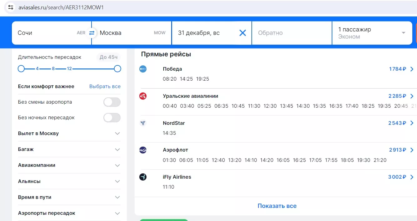 Желающие встретить Новый год 2024 в Москве могут улететь из Сочи 31 декабря за 2-3 тысячи рублей. По данным популярного сайта для поиска авиабилетов, прямые рейсы 31 декабря выполнят восемь авиакомпаний. На момент публикации новости стоимость самого дешева билета составляла 1 784 рубля.