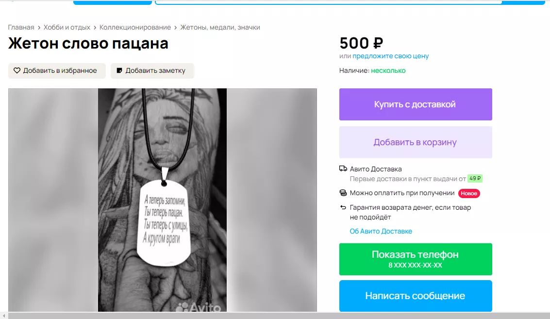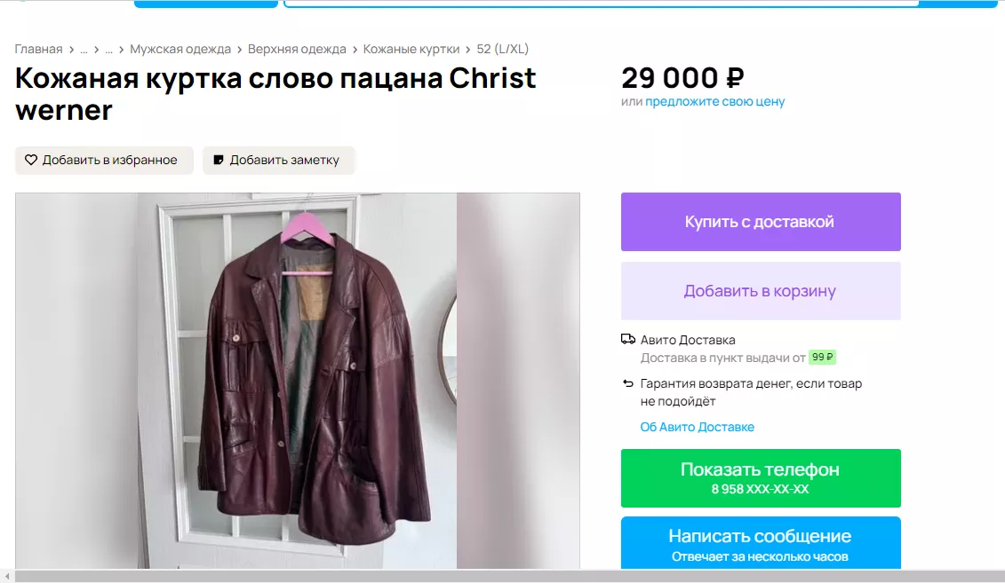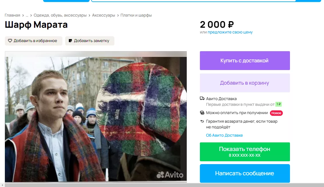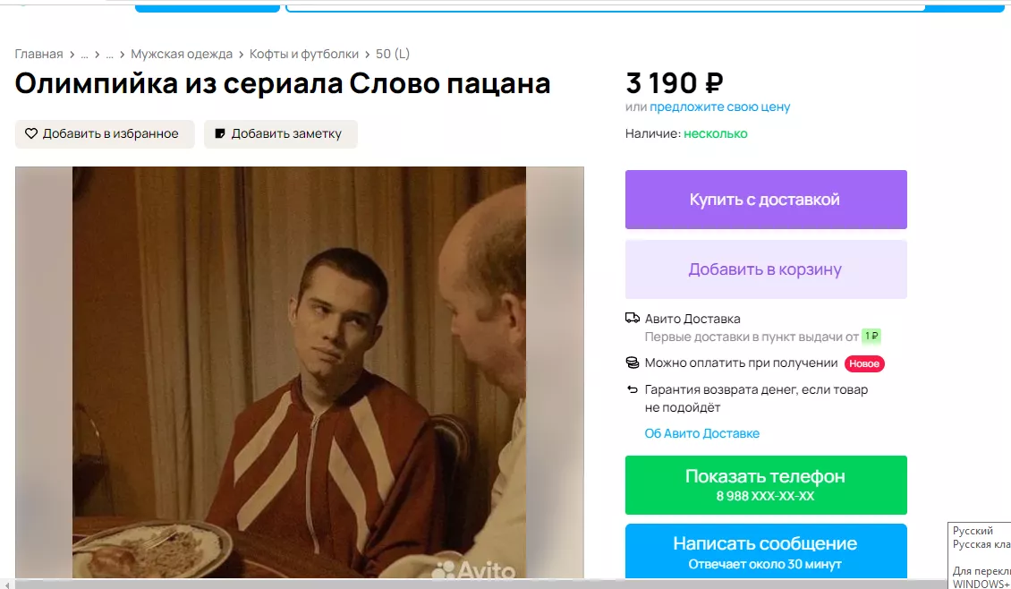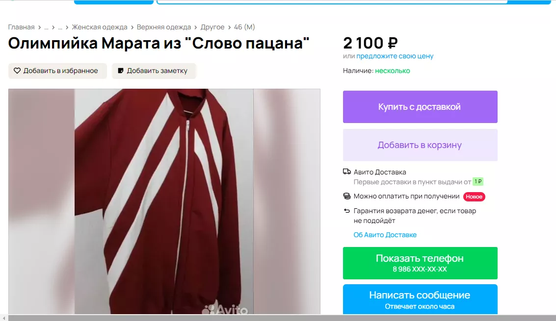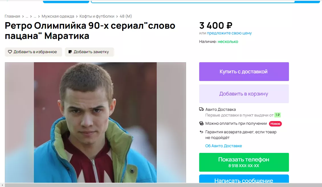 «Олимпийка из легендарных 90-х, один в один как у одного из героев сериала «Слово пацана. Кровь на асфальте» Маратика. Количество ограничено. Пошив под специальный заказ. Не массовое производство», — говорится в следующем объявлении из села Белая Глина. Цена вопроса — 3400 рублей.