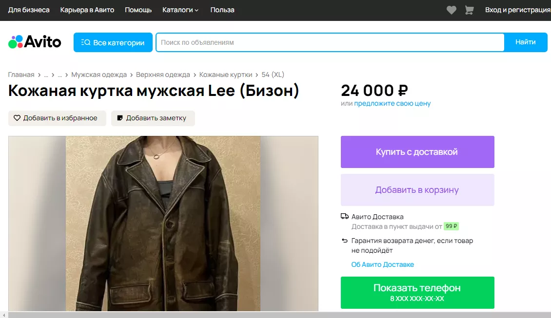 За 24 000 рублей можно пополнить гардероб мужской курткой марки Lee из натуральной кожи бизона. Продавец утверждает, что это оригинальная вещь, купленная в 1996 году за границей.