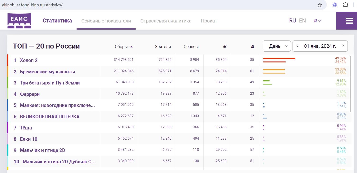 По данным Фонда кино, за один день, 1 января, кассы кинотеатров России пополнились на более чем 600 млн рублей. Лидерами проката в этот день стали фильмы «Холоп 2» и «Бременские музыканты». Эти картины в сумме собрали больше 500 млн рублей.