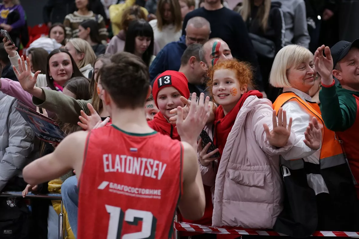• Центровой «Локо» Кирилл Елатонцев приветствует болельщиков после победы над ЦСКА © Федор Обмайкин для ПБК «Локомотив-Кубань», Lokobasket.com