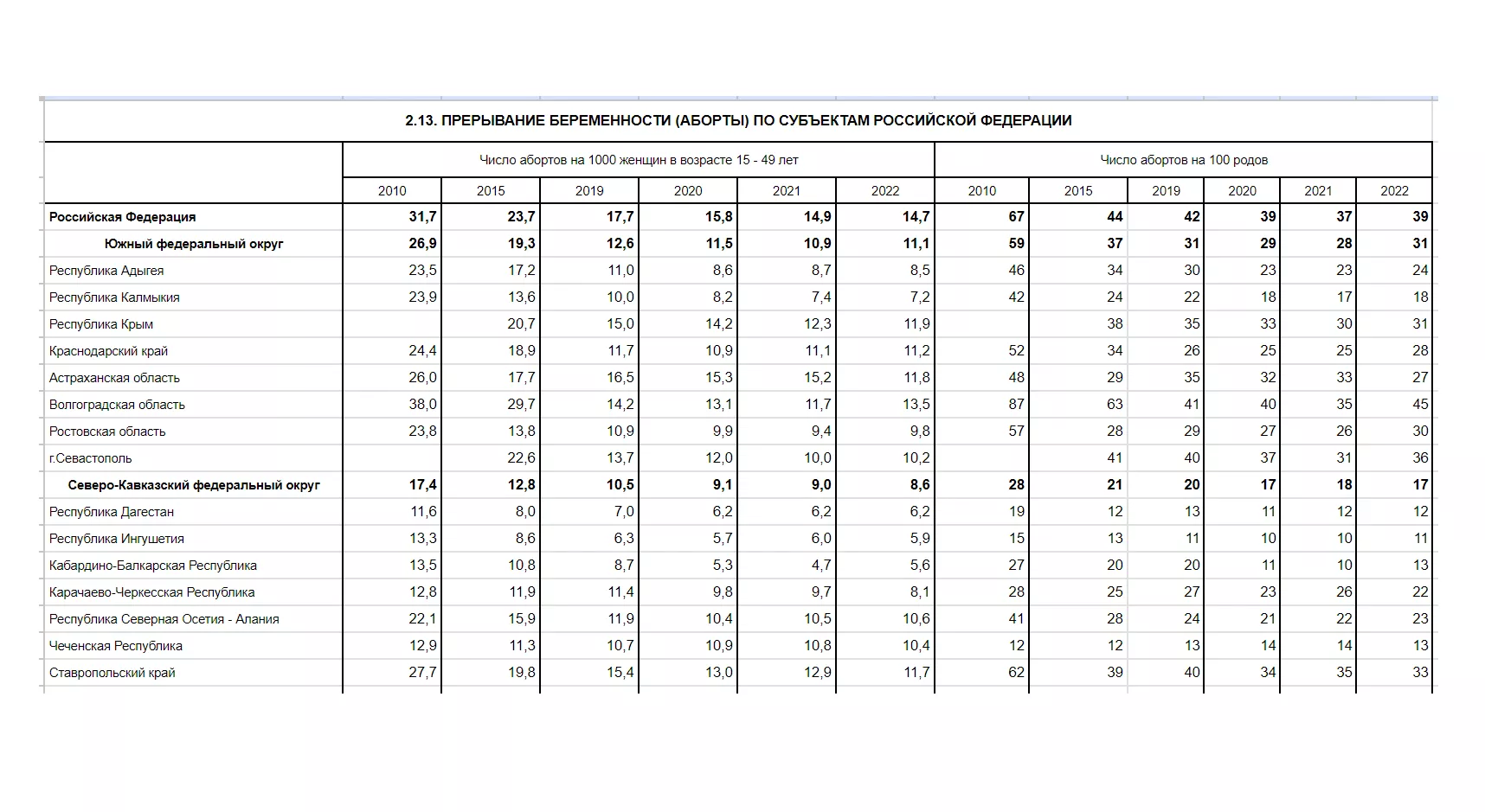 По данным Росстата, в Краснодарском крае и Ростовской области с 2020 по 2022 год увеличилось количество абортов. В 2020 году на Кубани на 1000 женщин в возрасте от 15 до 49 лет приходилось 10,9 прерываний беременности. В 2021 году данный коэффициент абортов в регионе достиг 11,1, а в 2022 году — 11,2. При этом в Краснодарском крае количество прерываний беременности на 100 родов в 2020 и 2021 году ровнялось 25, а в 2022 году — 28.