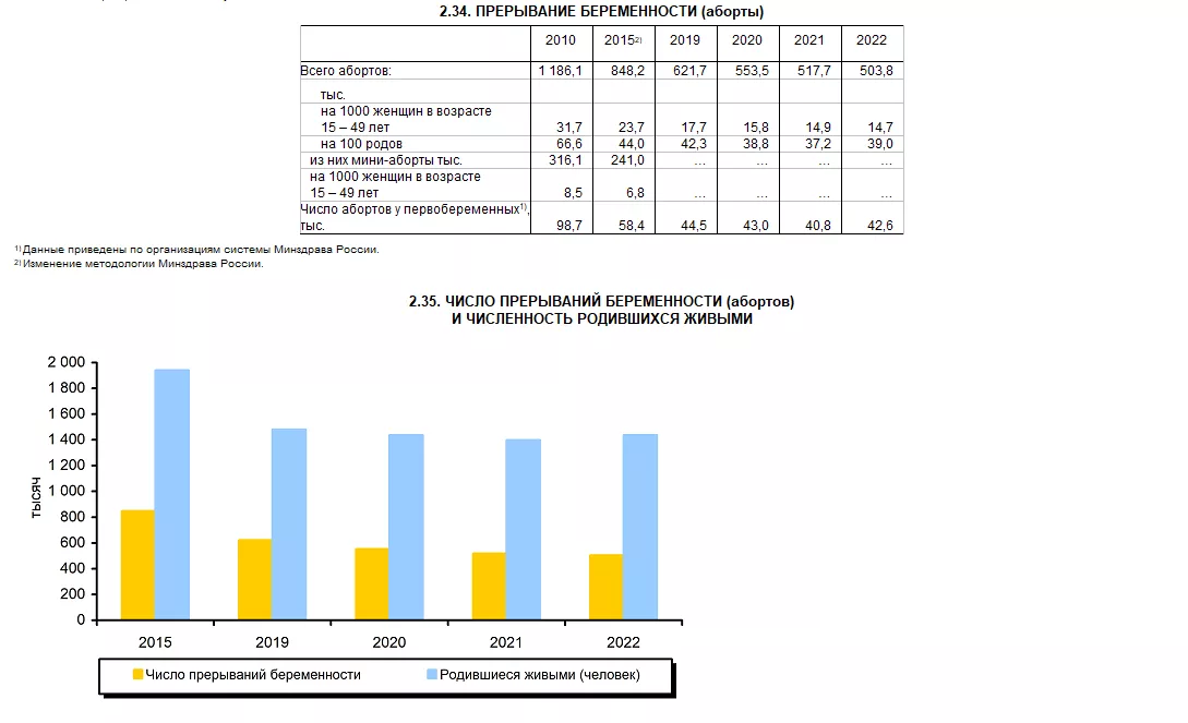 Согласно показателям Минздрава России, общее число абортов с 2010 по 2022 год снизилось с 1 млн 186,1 тыс. до 503,8 тыс. Однако частота прерываний беременности на 100 родов с 2021 по 2022 год выросла (с 37,2 тыс. до 39 тыс.).