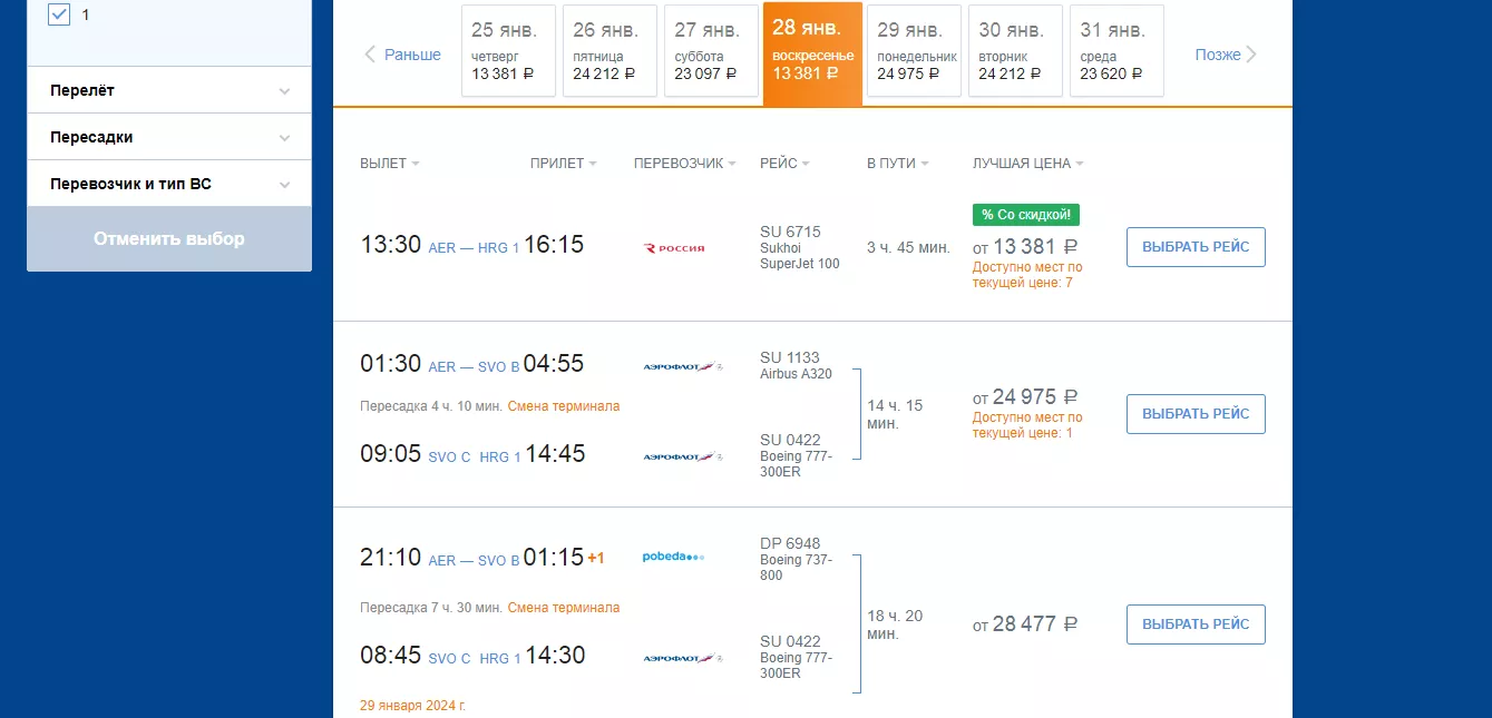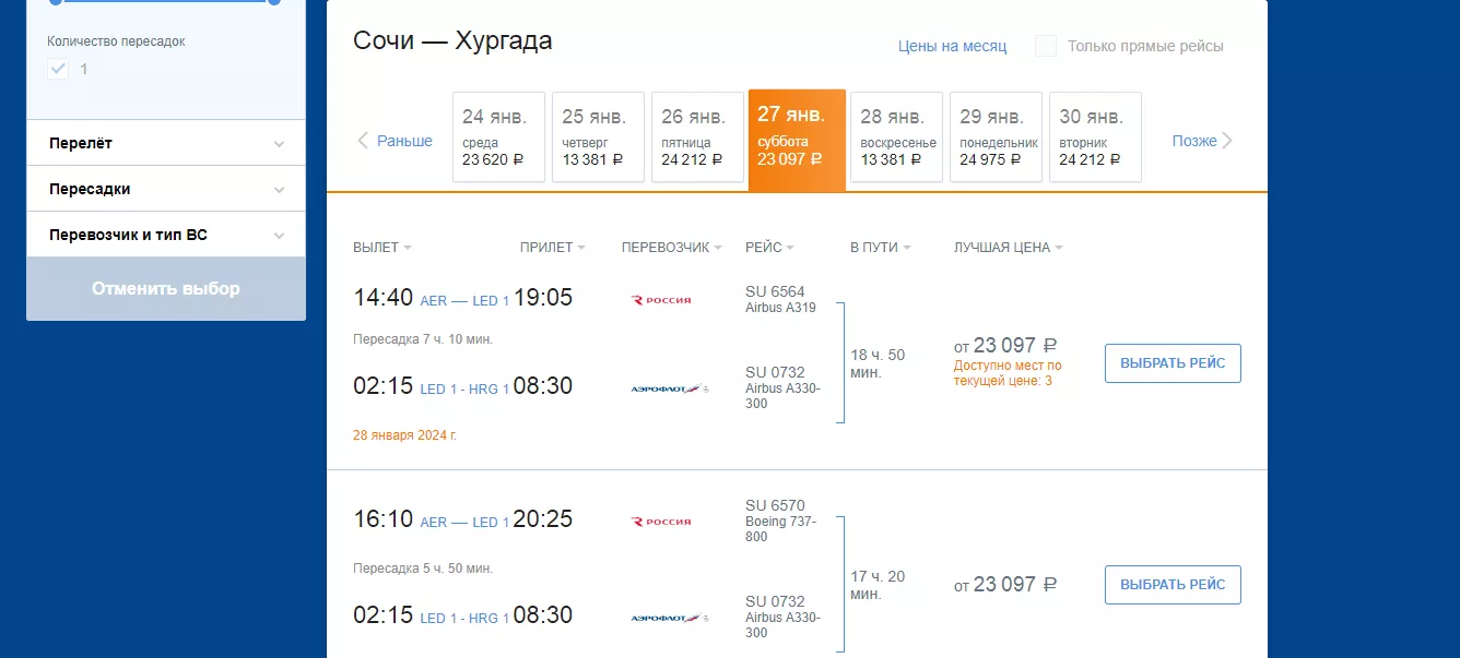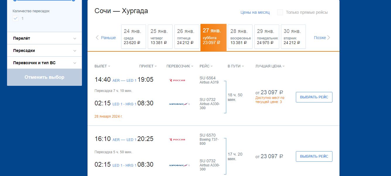 На сайте перевозчика можно купить билет в Хургаду на 27 января по цене от 23 тыс. 97 рублей. Лететь придется более 17 часов с пересадкой. 28 января стоимость билетов от 13 тыс. 381 рубля. Добраться до египетского курорта этим рейсом можно за 3 часа 45 минут. При этом в расписании указаны вылеты и после указанных дат.