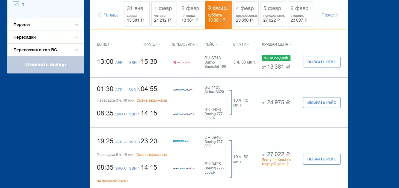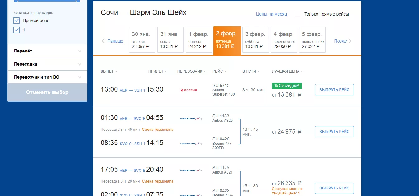 В Шарм-эш-Шейх на 2 февраля можно купить билеты от 13 тыс. 381 рубль. Время в пути составит 3 часа 30 минут. На 3 февраля аналогичная цена. Билеты в продаже.