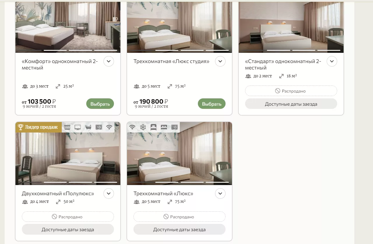По данным TourDom.ru, для бронирования на начало июня в санатории доступны только номера класса комфорт и только один трехкомнатный люкс. Другие варианты размещения уже распроданы.