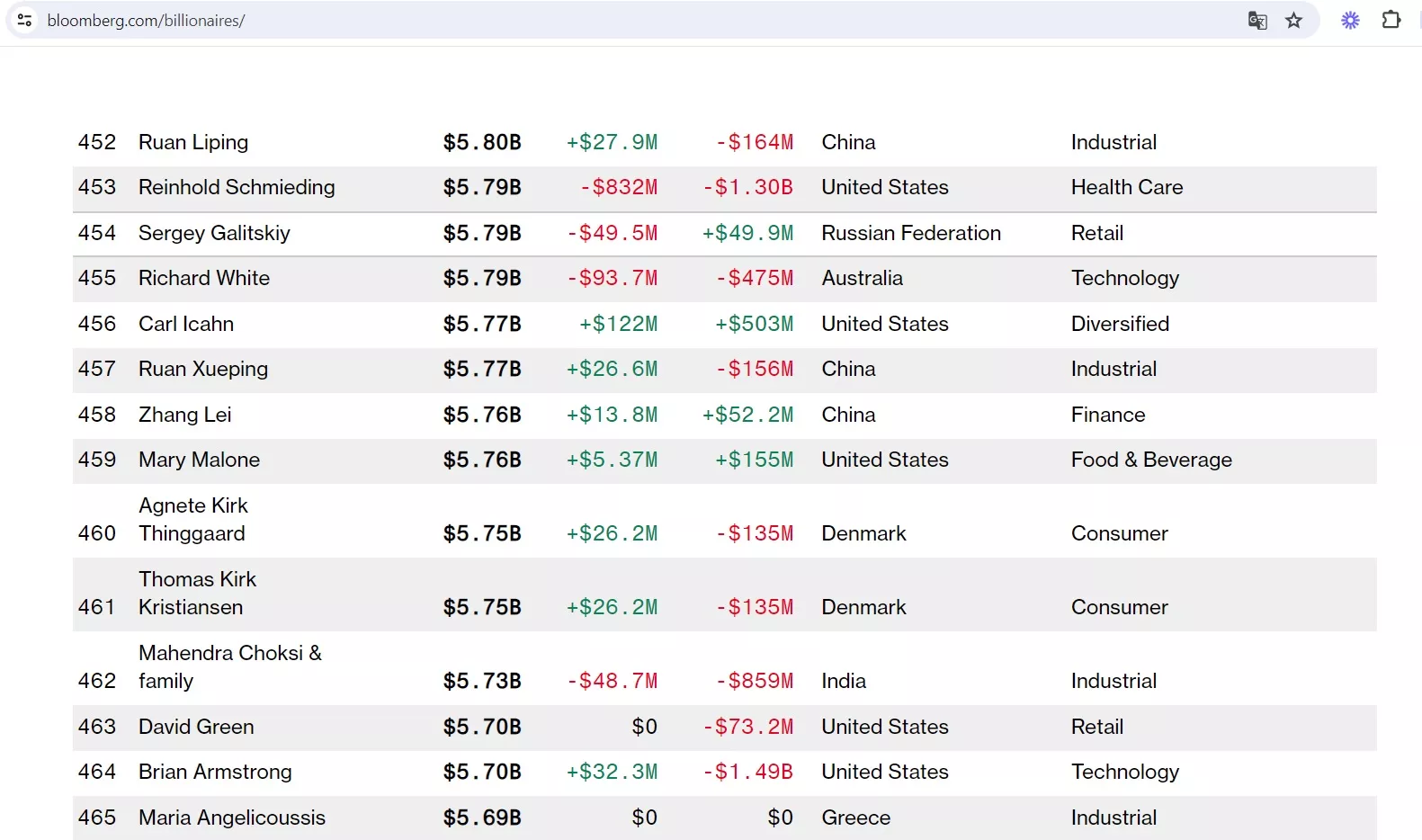 Индекс миллиардеров Bloomberg — это ежедневный рейтинг самых богатых людей мира. Цифры обновляются в конце каждого торгового дня в Нью-Йорке. Так, в графе о последних изменениях днем 3 февраля указано, что, по расчетам агентства, Галицкий потерял 49,5 млн долларов.