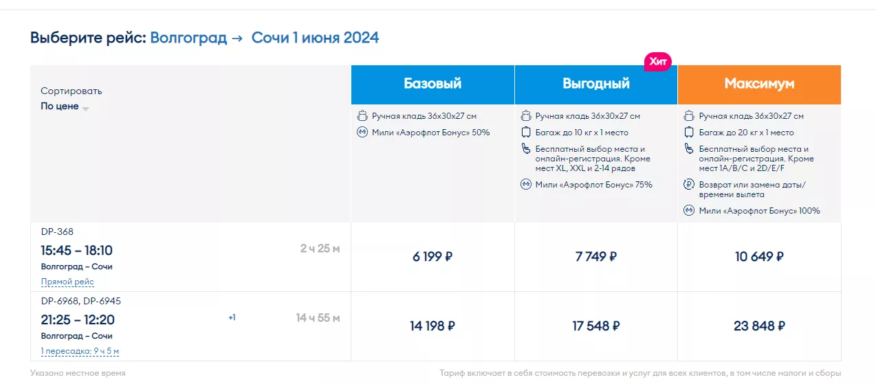 Стоимость на первый рейс из Волгограда в Сочи начинается от 6119 рублей за билет без багажа. Билет с одним местом багажа до 10 килограммов и бесплатным выбором места обойдется в 7749 рублей. Максимальный тариф, включающий в себя 20 килограммов багажа и возможность возврата или замены даты вылета, обойдется в 10649 рублей.