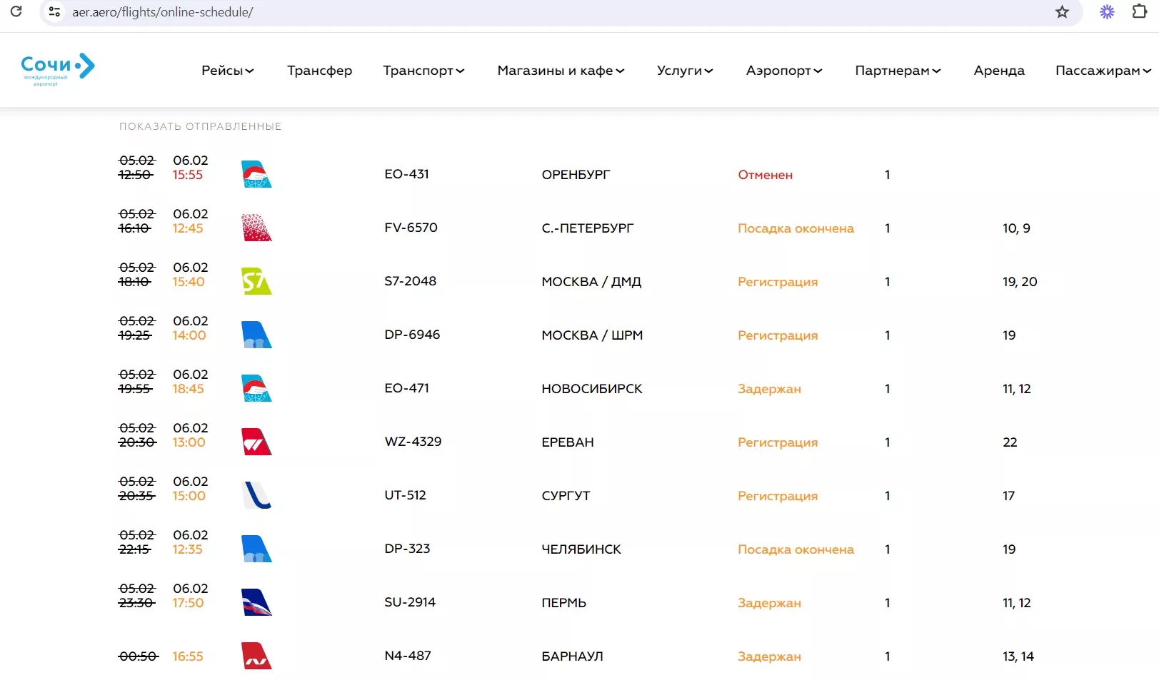 Из-за плохих погодных условий в аэропорту Сочи продолжают задерживать десятки рейсов на вылет. Утром 6 февраля более 1,2 тыс. пассажиров ожидали своих самолетов.