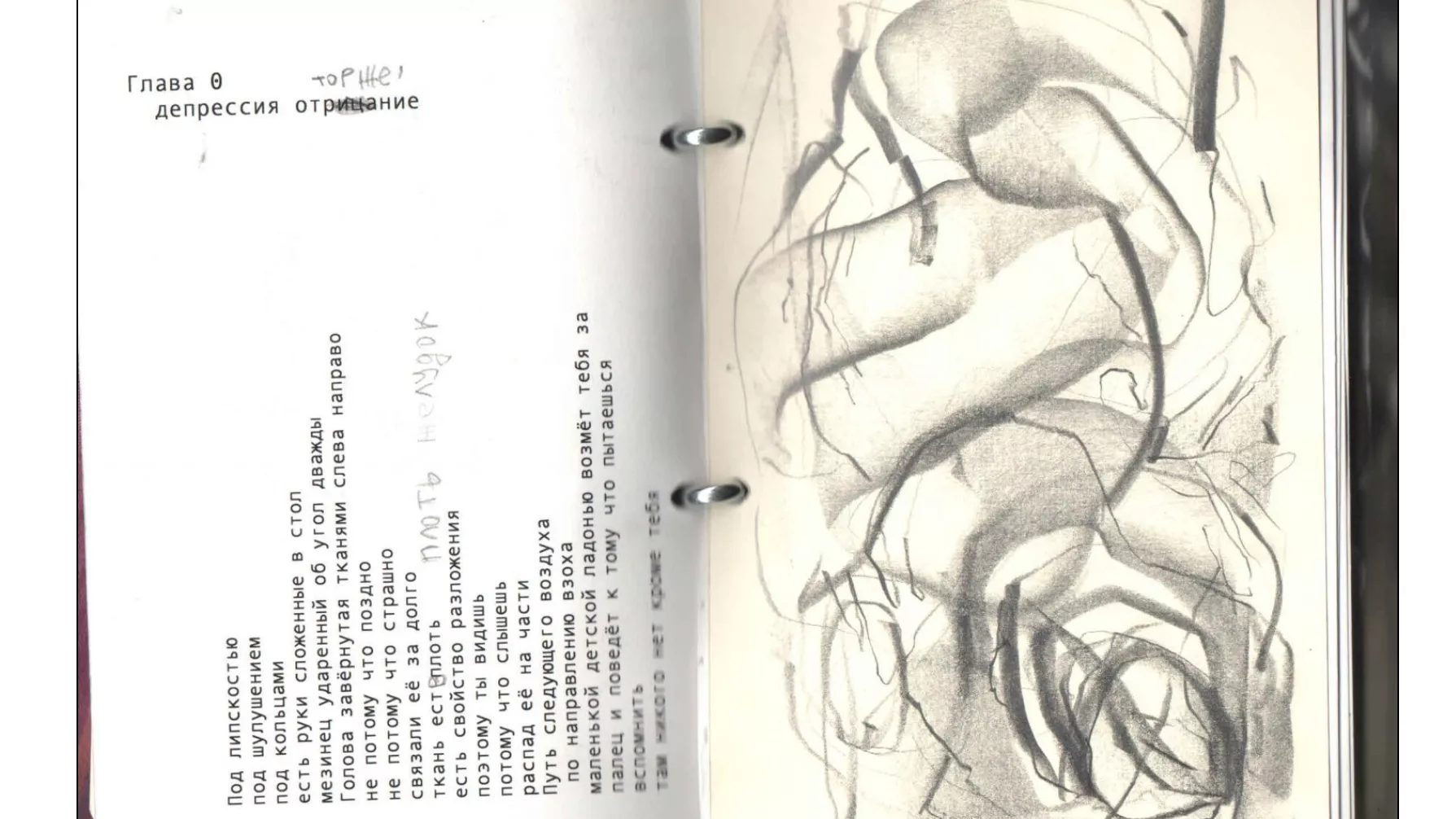 «Книга полностью собранная и проиллюстрированная мной, дневниковое произведение о перевалочном пункте в депрессии, попытка отпечатать осколки памяти и исследование моих ощущений и наблюдений о поэзии сейчашнего времени», — пояснила Корниенко.