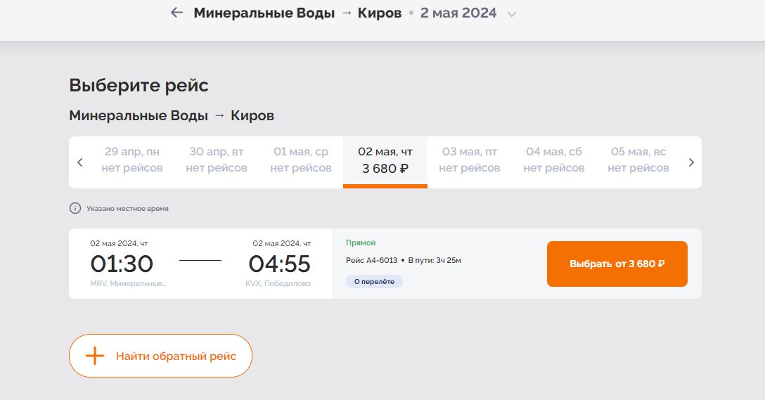 На сайте компании «Азимут» тоже появилась полетная программа. Билет на рейс 2 мая стоит от 3 тыс. 680 рублей.