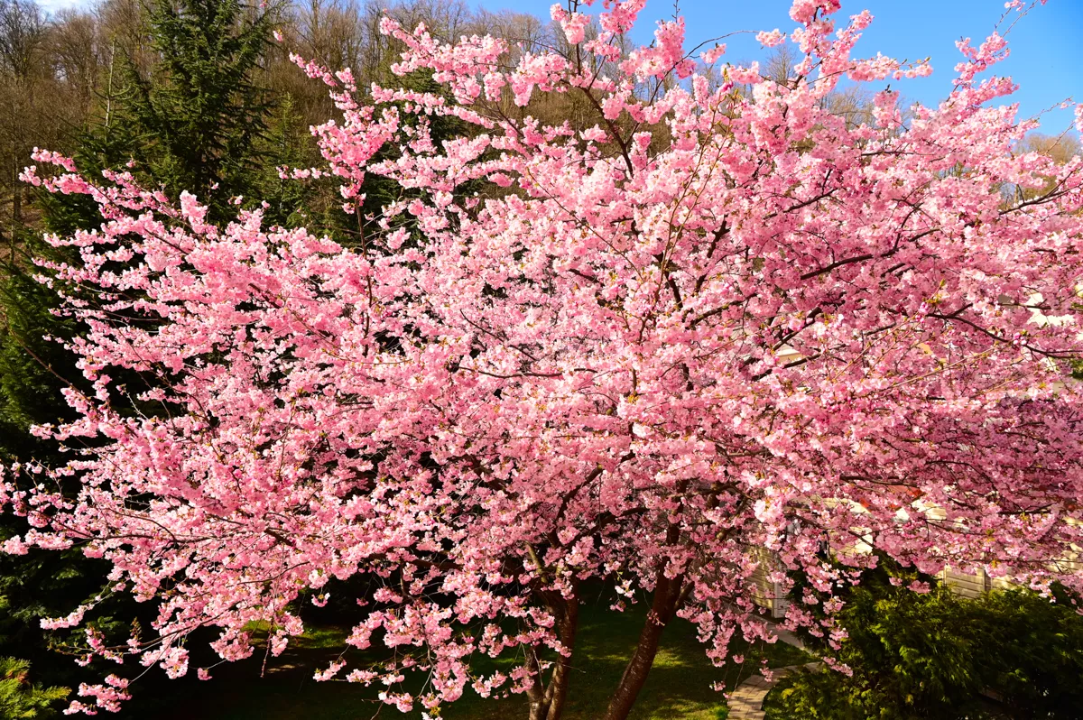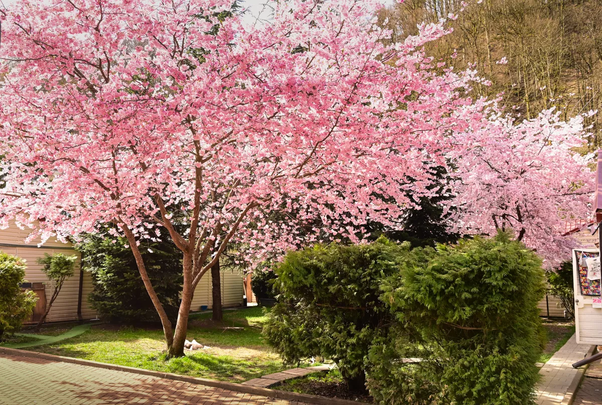 Нежно-розовыми цветами покрылись японские вишни Саржента в трех локациях курорта «Роза Хутор»