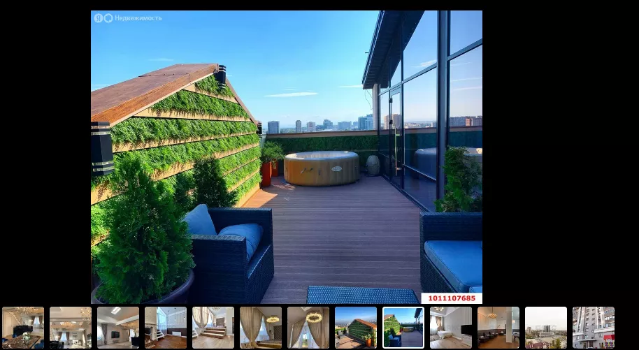 Пентхаус с дизайнерским ремонтом, террасой с диванчиками и бассейном на крыше. В квартире есть детская, гостевая, спальня, комната для совещаний, гостиная, кухня, два санузла. Из каждого окна открывается вид на Краснодар. Цена по состоянию на 4 апреля — 112 млн 750 тыс. рублей.