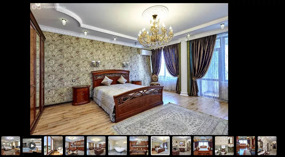 Квартира в классическом стиле. Интерьер украшает резная мебель и колонны. Предусмотрены три изолированные спальни со своими санузлами, гостиная с витражным остеклением и выходом на открытый балкон с видом на город, гардеробная и кухня. Цена по состоянию на 4 апреля —19 млн 498 тыс. 256 рублей.