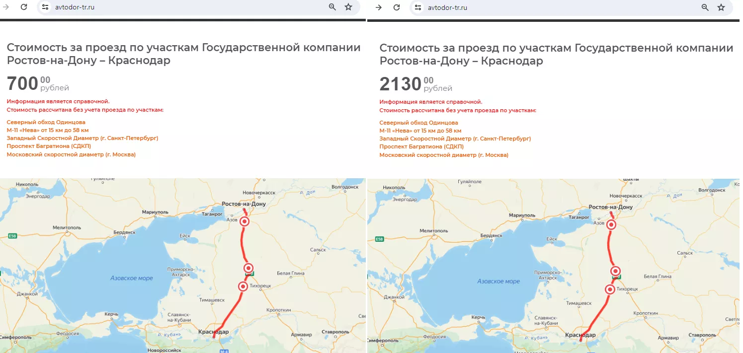 Калькулятор на сайте «Автодора» оценивает маршрут из Ростова-на-Дону в Краснодар для легковой машины в будние дни в 700 рублей, 840 рублей — в выходные или праздники. Для самой дорогой категории IV (крупногабаритный грузовой транспорт и автобусы) цена составит 2130 рублей.