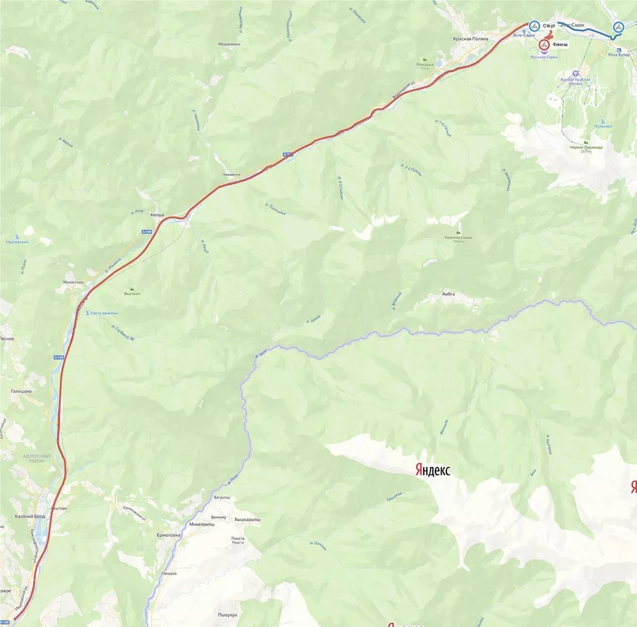 - 11 мая с 14:40 до 16:30 от перекрестка с организацией кругового движения на 45 километре А-149 Адлер-Красная Поляна (пересечение улицы Эстонская и улицы Олимпийская) до площади Сбербанка курорта «Красная Поляна», в том числе в местах примыкания улицы Созвездий с улицами Гармонии, Февральской и Горной;